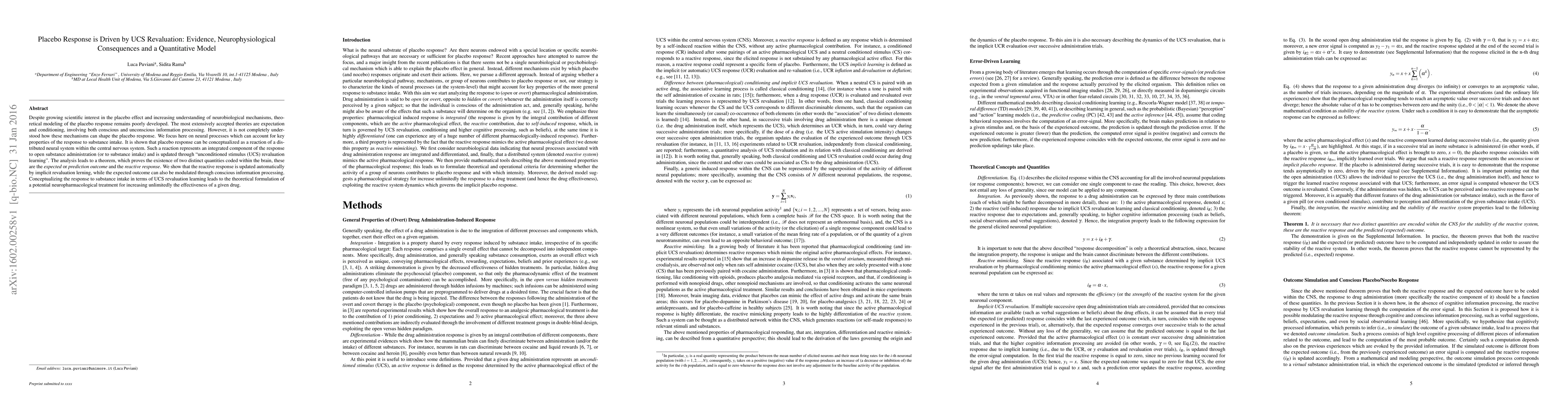 This paper explores how the placebo response is driven by unconditioned stimulus (UCS) revaluation, proposing a neurophysiological model that integrates neural processes to explain the response to substance intake. It concludes that the placebo response involves distinct brain-coded quantities: an automatic reactive response updated by implicit learning and an expected outcome modulated by conscious processing.