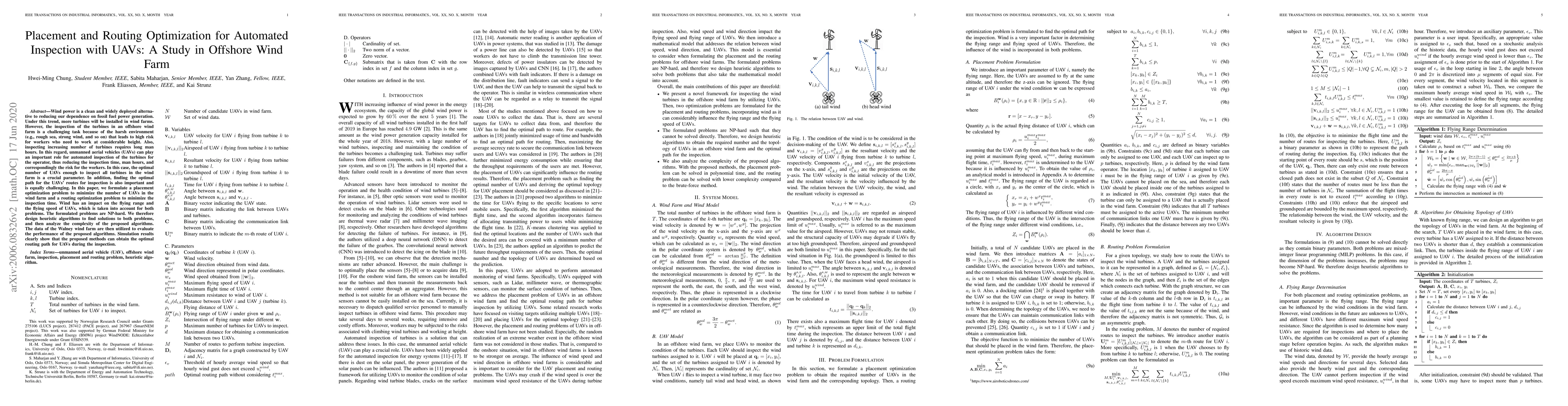 Wind power is a clean and widely deployed alternative to reducing our dependence on fossil fuel power generation. Under this trend, more turbines will be installed in wind farms. However, the inspection of the turbines in an offshore wind farm is a challenging task because of the harsh environment (e.g., rough sea, strong wind, and so on) that leads to high risk for workers who need to work at considerable height. Also, inspecting increasing number of turbines requires long man hours. In this regard, unmanned aerial vehicles (UAVs) can play an important role for automated inspection of the turbines for the operator, thus reducing the inspection time, man hours, and correspondingly the risk for the workers. In this case, the optimal number of UAVs enough to inspect all turbines in the wind farm is a crucial parameter. In addition, finding the optimal path for the UAVs' routes for inspection is also important and is equally challenging. In this paper, we formulate a placement optimization problem to minimize the number of UAVs in the wind farm and a routing optimization problem to minimize the inspection time. Wind has an impact on the flying range and the flying speed of UAVs, which is taken into account for both problems. The formulated problems are NP-hard. We therefore design heuristic algorithms to find solutions to both problems, and then analyze the complexity of the proposed algorithms. The data of the Walney wind farm are then utilized to evaluate the performance of the proposed algorithms. Simulation results clearly show that the proposed methods can obtain the optimal routing path for UAVs during the inspection.