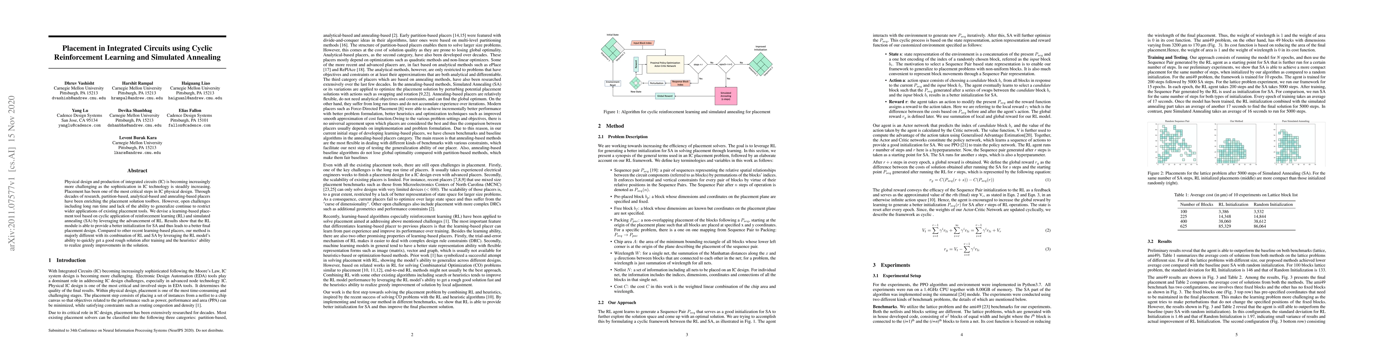 This paper proposes a novel placement tool for Integrated Circuits using cyclic Reinforcement Learning and Simulated Annealing, aiming to address long run times and generalization issues. The RL module provides a better initial placement, which enhances the SA's ability to achieve optimal final placement designs.