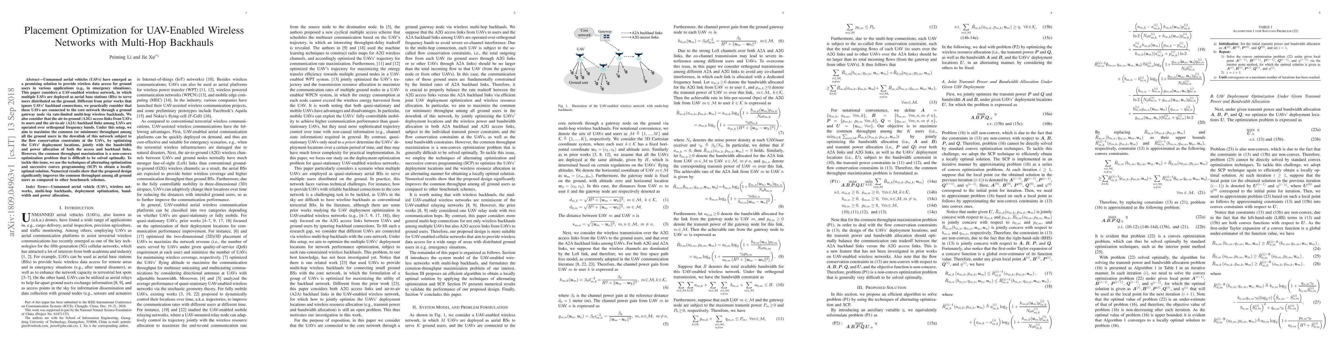 This paper optimizes the placement of multiple UAVs acting as aerial base stations to maximize common throughput for ground users, considering both air-to-ground and air-to-air links over orthogonal frequency bands. It addresses the non-convex optimization problem using alternating optimization and successive convex programming, achieving significant improvements over benchmark schemes.