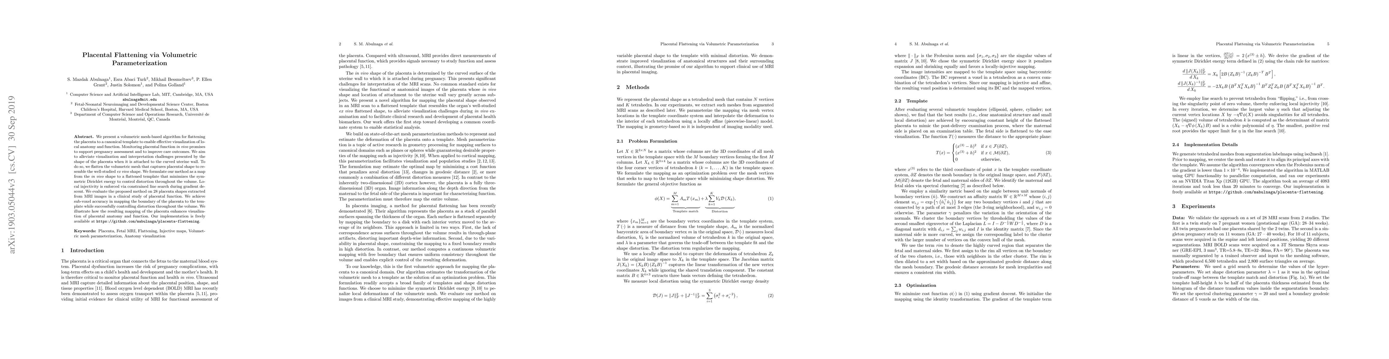 This paper introduces a volumetric mesh-based algorithm to flatten the placenta for better visualization, minimizing distortion and enhancing the understanding of placental anatomy and function. The method achieves sub-voxel accuracy and is evaluated on MRI-derived placenta shapes from a clinical study.