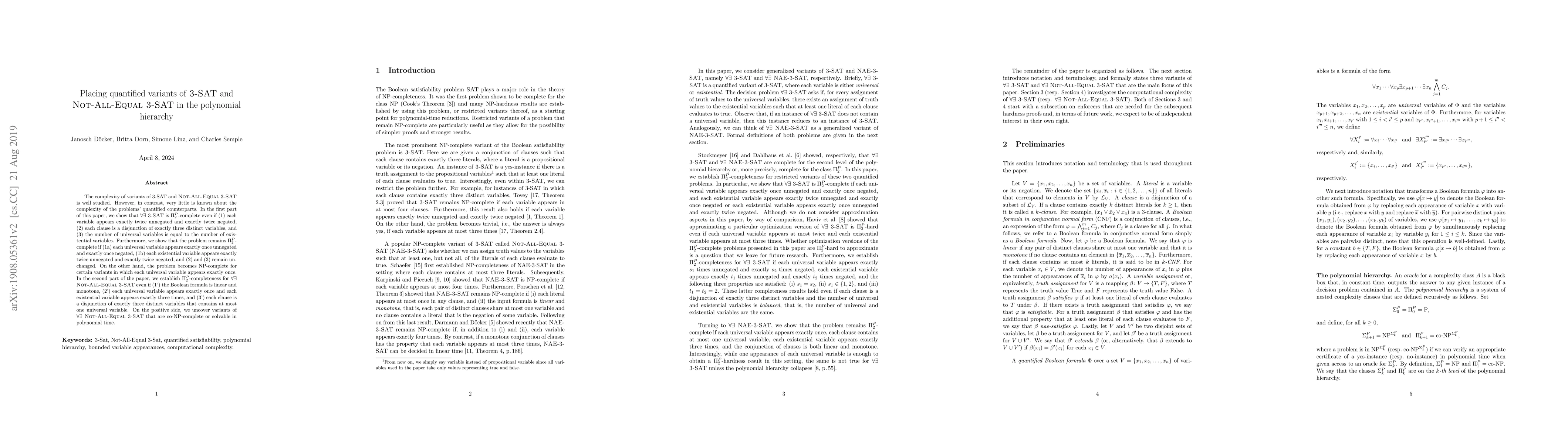 This paper demonstrates the $\Pi_2^P$-completeness of quantified variants of 3-SAT and Not-All-Equal 3-SAT under specific constraints, while also identifying certain variants that are NP-complete or solvable in polynomial time.