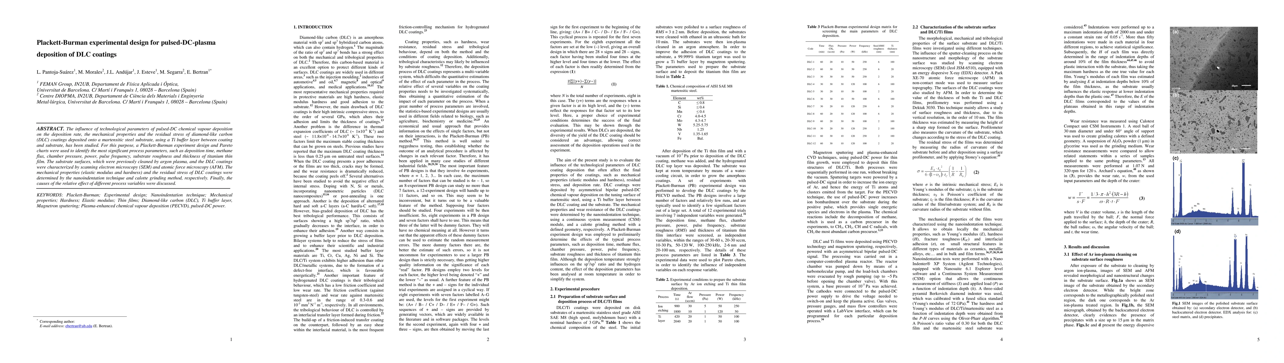 The influence of technological parameters of pulsed-DC chemical vapour deposition on the deposition rate, the mechanical properties and the residual stress of diamond-like carbon (DLC) coatings deposited onto a martensitic steel substrate, using a Ti buffer layer between coating and substrate, has been studied. For this purpose, a Plackett-Burman experiment design and Pareto charts were used to identify the most significant process parameters, such as deposition time, methane flux, chamber pressure, power, pulse frequency, substrate roughness and thickness of titanium thin film. The substrate surfaces, which were previously cleaned by argon plasma, and the DLC coatings were characterized by scanning electron microscopy (SEM) and atomic force microscopy (AFM). The mechanical properties (elastic modulus and hardness) and the residual stress of DLC coatings were determined by the nanoindentation technique and calotte grinding method, respectively. Finally, the causes of the relative effect of different process variables were discussed.