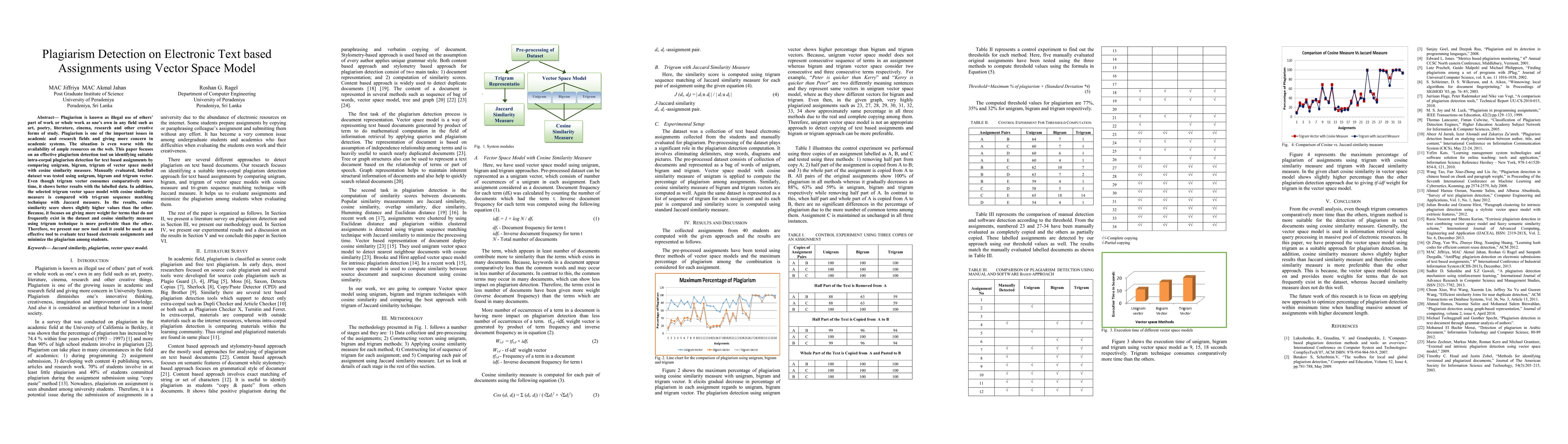 This research presents an effective plagiarism detection tool for electronic text-based assignments, which can help minimize plagiarism among students.