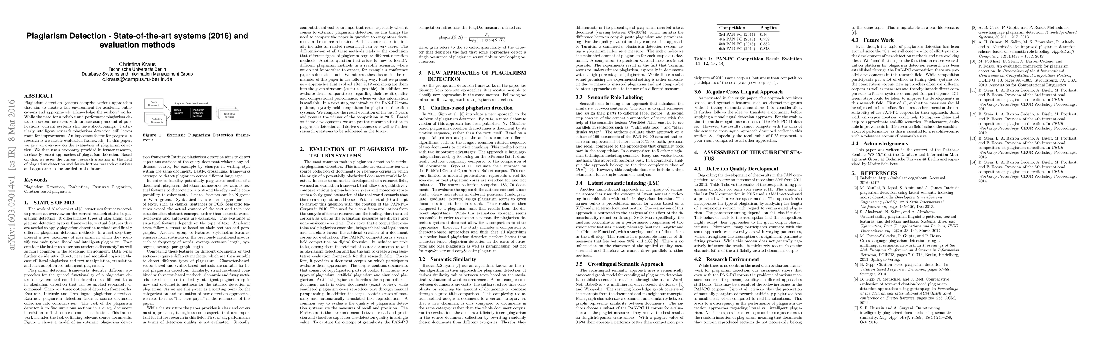 Plagiarism detection systems comprise various approaches that aim to create a fair environment for academic publications and appropriately acknowledge the authors' works. While the need for a reliable and performant plagiarism detection system increases with an increasing amount of publications, current systems still have shortcomings. Particularly intelligent research plagiarism detection still leaves room for improvement. An important factor for progress in research is a suitable evaluation framework. In this paper, we give an overview on the evaluation of plagiarism detection. We then use a taxonomy provided in former research, to classify recent approaches of plagiarism detection. Based on this, we asses the current research situation in the field of plagiarism detection and derive further research questions and approaches to be tackled in the future.