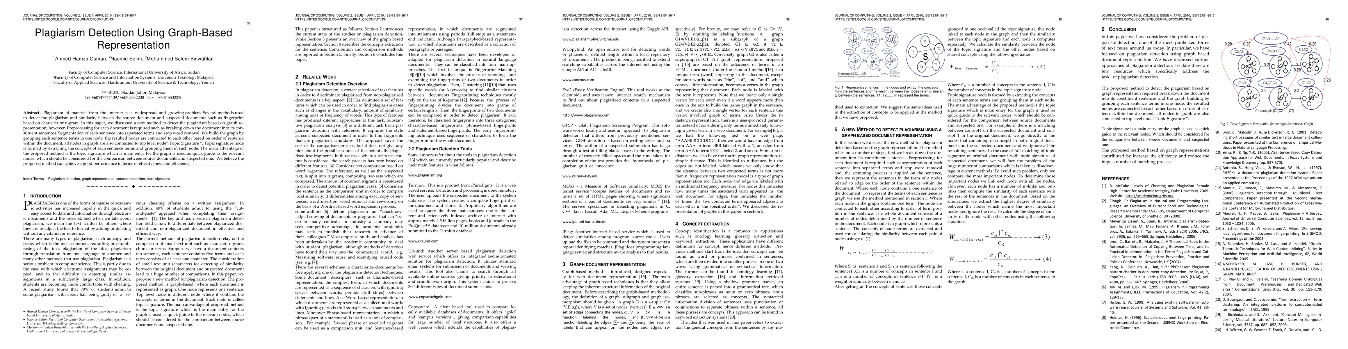 Plagiarism of material from the Internet is a widespread and growing problem. Several methods used to detect the plagiarism and similarity between the source document and suspected documents such as fingerprint based on character or n-gram. In this paper, we discussed a new method to detect the plagiarism based on graph representation; however, Preprocessing for each document is required such as breaking down the document into its constituent sentences. Segmentation of each sentence into separated terms and stop word removal. We build the graph by grouping each sentence terms in one node, the resulted nodes are connected to each other based on order of sentence within the document, all nodes in graph are also connected to top level node "Topic Signature". Topic signature node is formed by extracting the concepts of each sentence terms and grouping them in such node. The main advantage of the proposed method is the topic signature which is main entry for the graph is used as quick guide to the relevant nodes. which should be considered for the comparison between source documents and suspected one. We believe the proposed method can achieve a good performance in terms of effectiveness and efficiency.