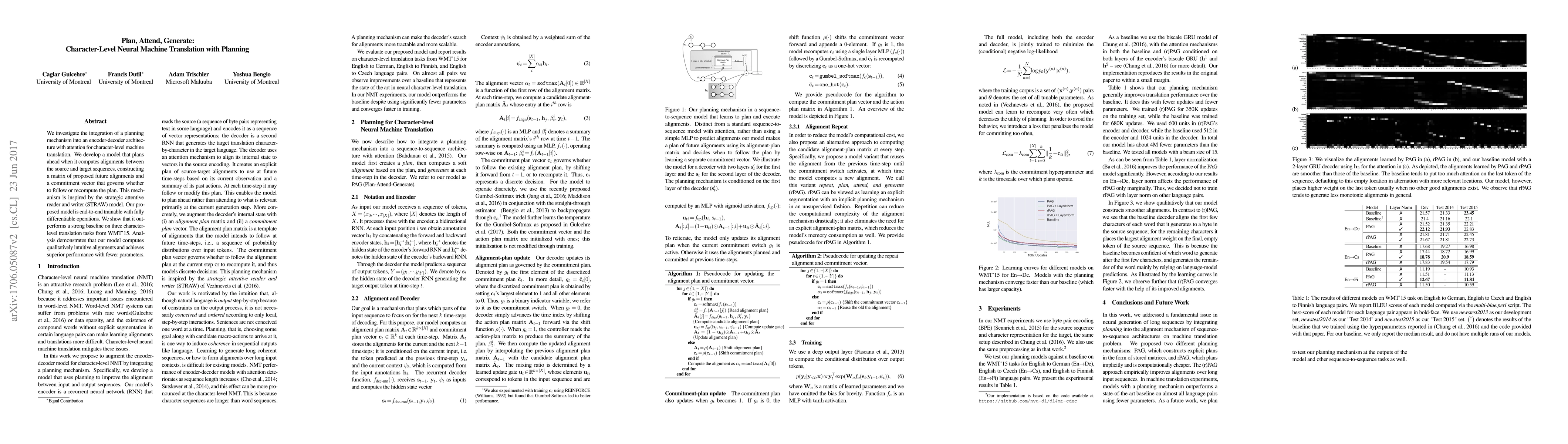 This paper proposes a character-level neural machine translation model that incorporates a planning mechanism in the decoder, inspired by the STRAW model, to improve translation quality. The model outperforms baselines on the WMT'15 corpus, demonstrating both intuitive alignments and superior performance with fewer parameters.