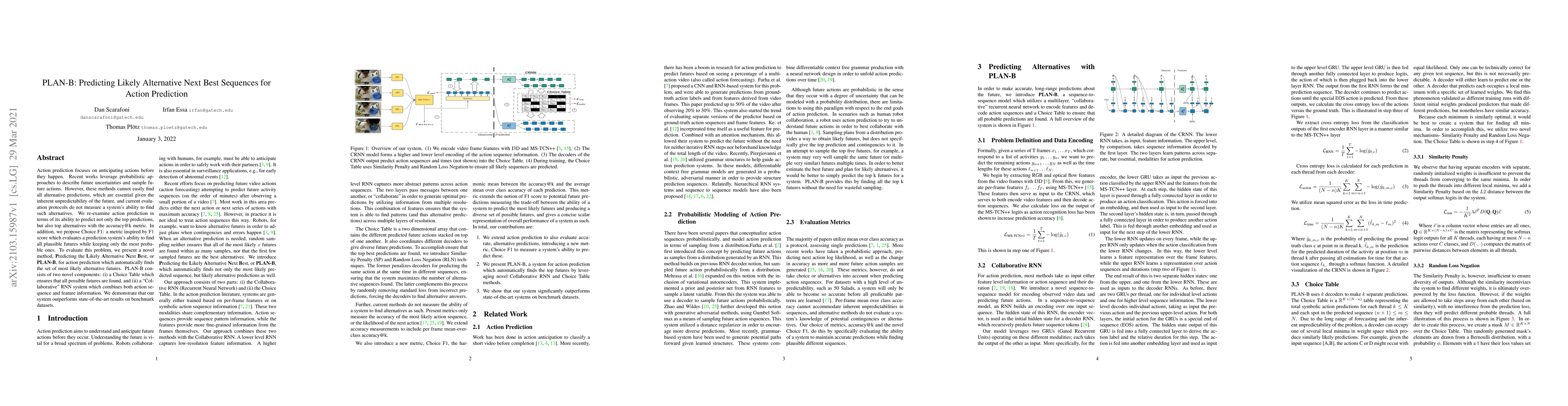 The paper introduces PLAN-B, a method for predicting alternative next best action sequences, addressing the limitation of existing probabilistic approaches in capturing all possible futures. PLAN-B uses a Choice Table and a Collaborative RNN system to find the most likely alternative futures, outperforming current state-of-the-art methods on benchmark datasets.