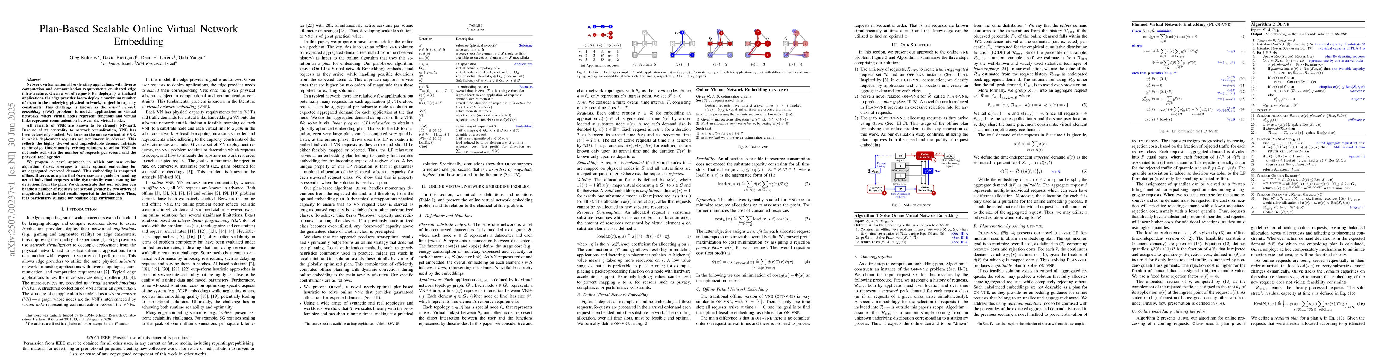 The paper proposes OLIVE, an online algorithm for VNE that leverages a nearly optimal embedding for aggregated expected demand, computed offline as a plan, to dynamically handle individual requests while compensating for deviations from the plan.
