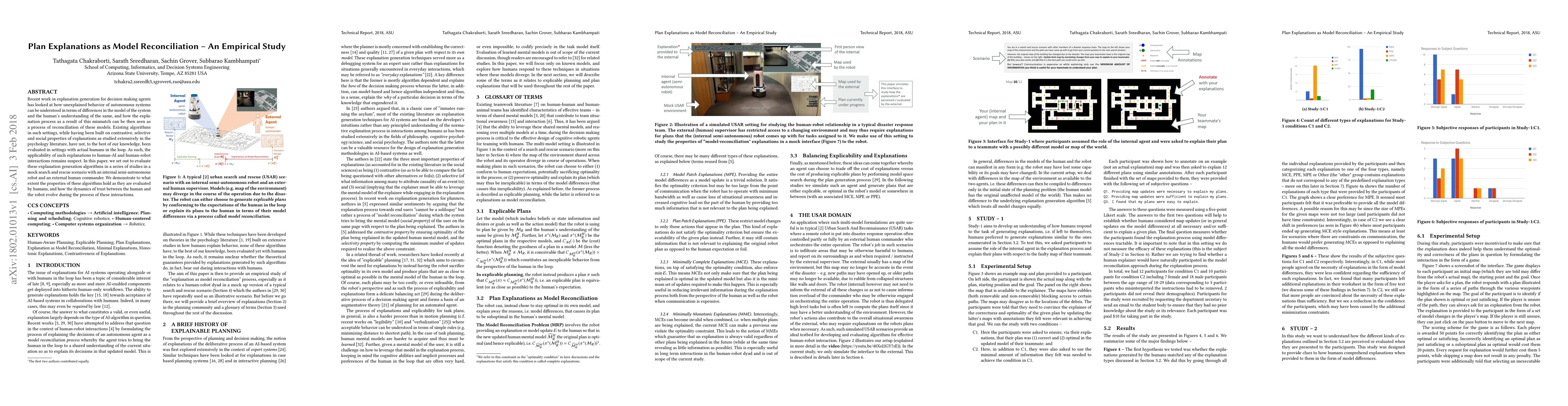 Recent work in explanation generation for decision making agents has looked at how unexplained behavior of autonomous systems can be understood in terms of differences in the model of the system and the human's understanding of the same, and how the explanation process as a result of this mismatch can be then seen as a process of reconciliation of these models. Existing algorithms in such settings, while having been built on contrastive, selective and social properties of explanations as studied extensively in the psychology literature, have not, to the best of our knowledge, been evaluated in settings with actual humans in the loop. As such, the applicability of such explanations to human-AI and human-robot interactions remains suspect. In this paper, we set out to evaluate these explanation generation algorithms in a series of studies in a mock search and rescue scenario with an internal semi-autonomous robot and an external human commander. We demonstrate to what extent the properties of these algorithms hold as they are evaluated by humans, and how the dynamics of trust between the human and the robot evolve during the process of these interactions.
