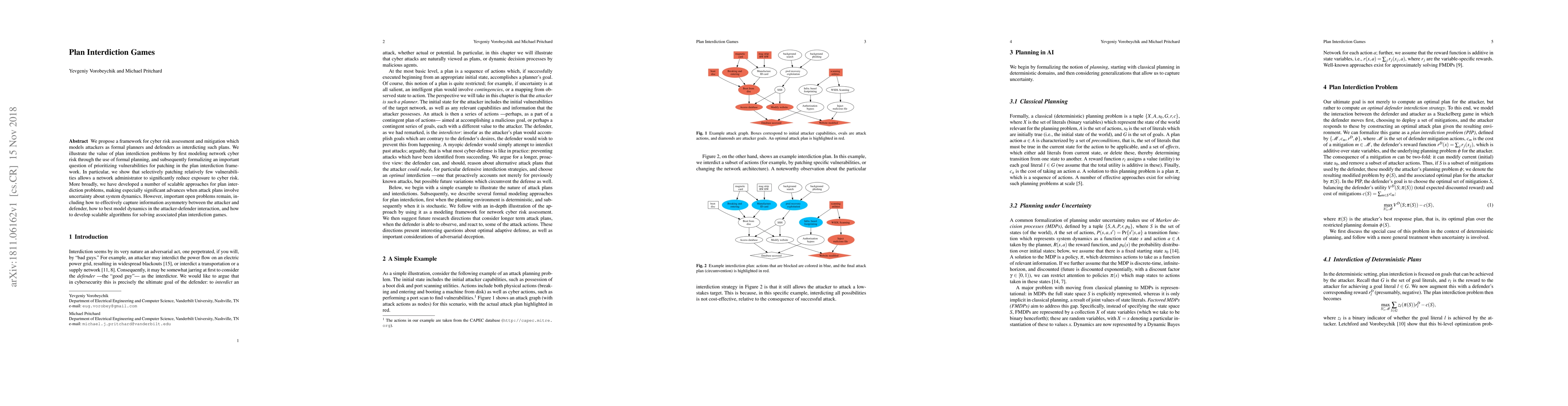 We propose a framework for cyber risk assessment and mitigation which models attackers as formal planners and defenders as interdicting such plans. We illustrate the value of plan interdiction problems by first modeling network cyber risk through the use of formal planning, and subsequently formalizing an important question of prioritizing vulnerabilities for patching in the plan interdiction framework. In particular, we show that selectively patching relatively few vulnerabilities allows a network administrator to significantly reduce exposure to cyber risk. More broadly, we have developed a number of scalable approaches for plan interdiction problems, making especially significant advances when attack plans involve uncertainty about system dynamics. However, important open problems remain, including how to effectively capture information asymmetry between the attacker and defender, how to best model dynamics in the attacker-defender interaction, and how to develop scalable algorithms for solving associated plan interdiction games.