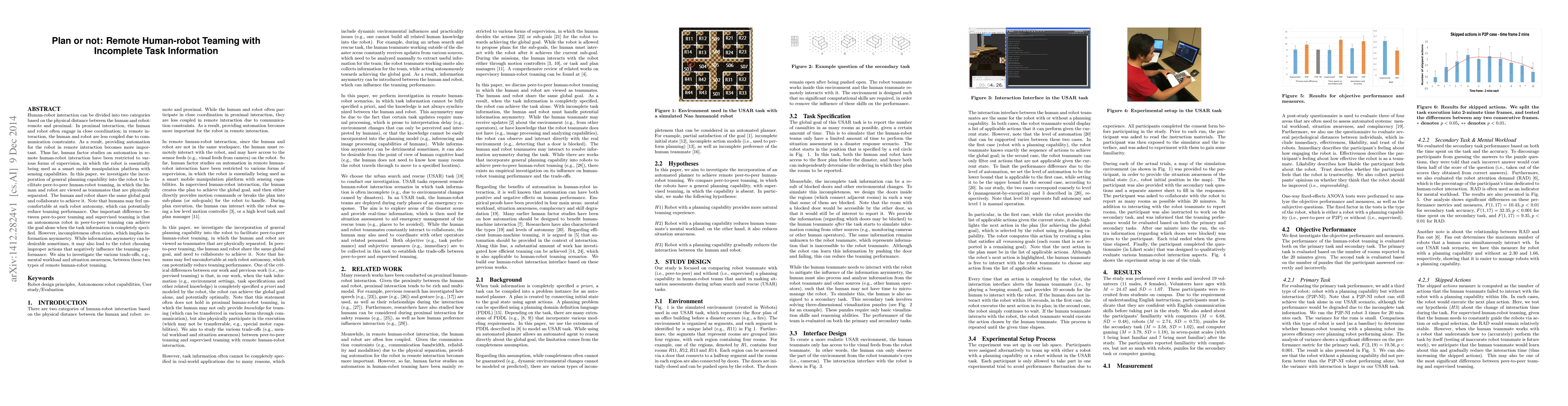 Human-robot interaction can be divided into two categories based on the physical distance between the human and robot: remote and proximal. In proximal interaction, the human and robot often engage in close coordination; in remote interaction, the human and robot are less coupled due to communication constraints. As a result, providing automation for the robot in remote interaction becomes more important. Thus far, human factor studies on automation in remote human-robot interaction have been restricted to various forms of supervision, in which the robot is essentially being used as a smart mobile manipulation platform with sensing capabilities. In this paper, we investigate the incorporation of general planning capability into the robot to facilitate peer-to-peer human-robot teaming, in which the human and robot are viewed as teammates that are physically separated. The human and robot share the same global goal and collaborate to achieve it. Note that humans may feel uncomfortable at such robot autonomy, which can potentially reduce teaming performance. One important difference between peer-to-peer teaming and supervised teaming is that an autonomous robot in peer-to-peer teaming can achieve the goal alone when the task information is completely specified. However, incompleteness often exists, which implies information asymmetry. While information asymmetry can be desirable sometimes, it may also lead to the robot choosing improper actions that negatively influence the teaming performance. We aim to investigate the various trade-offs, e.g., mental workload and situation awareness, between these two types of remote human-robot teaming.