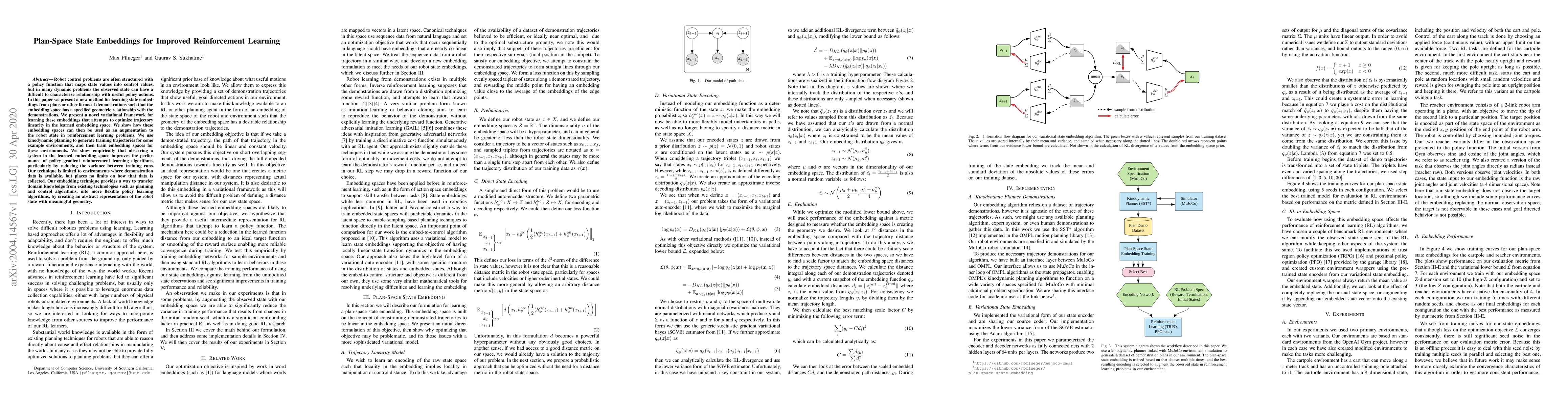 This paper introduces a method for learning state embeddings from plan demonstrations to improve reinforcement learning in robot control. It employs a variational framework to optimize trajectory linearity in the embedding space, which enhances policy gradient algorithms by reducing training variance. The technique leverages kinodynamic planning for training and is applicable to environments with available demonstration data.