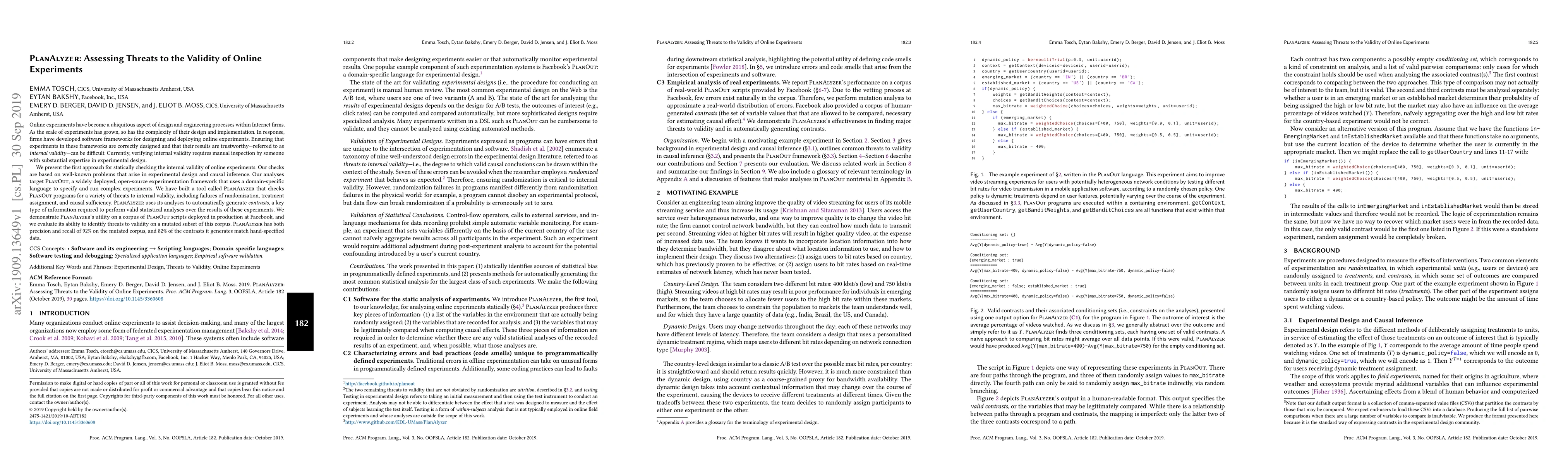 PlanAlyzer is a tool for statically checking the internal validity of online experiments conducted using PlanOut, identifying threats like randomization failures. It automatically generates contrasts to support valid statistical analyses, demonstrating high precision and recall on a Facebook production corpus.