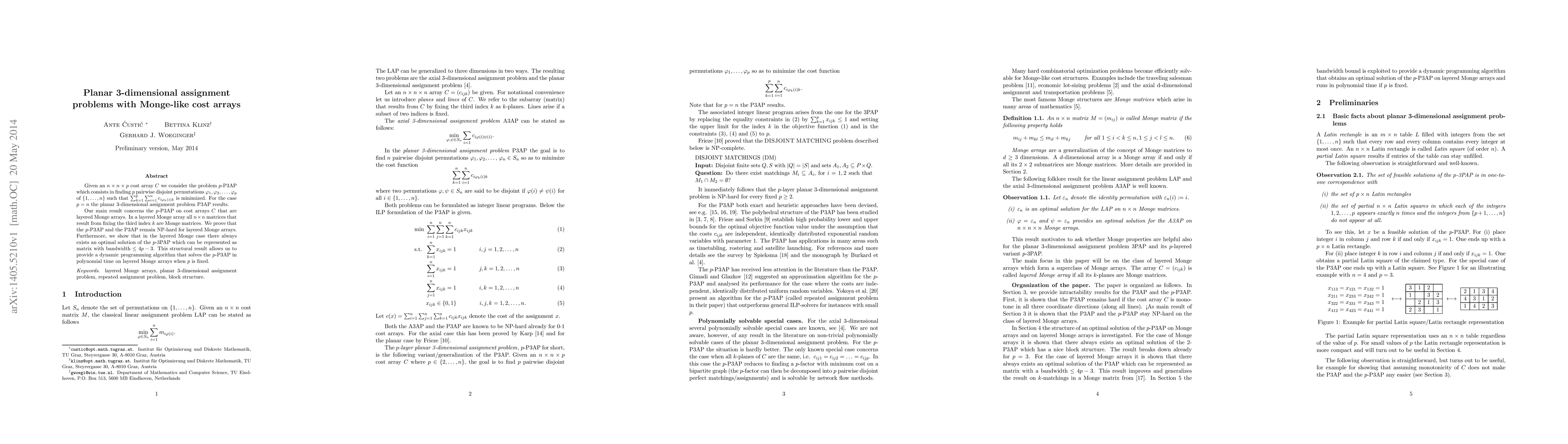 The paper investigates a variant of the assignment problem known as $p$-P3AP on layered Monge arrays, proving that it remains NP-hard but finding an optimal solution with a specific structural constraint, allowing for polynomial-time dynamic programming solutions when $p$ is fixed.