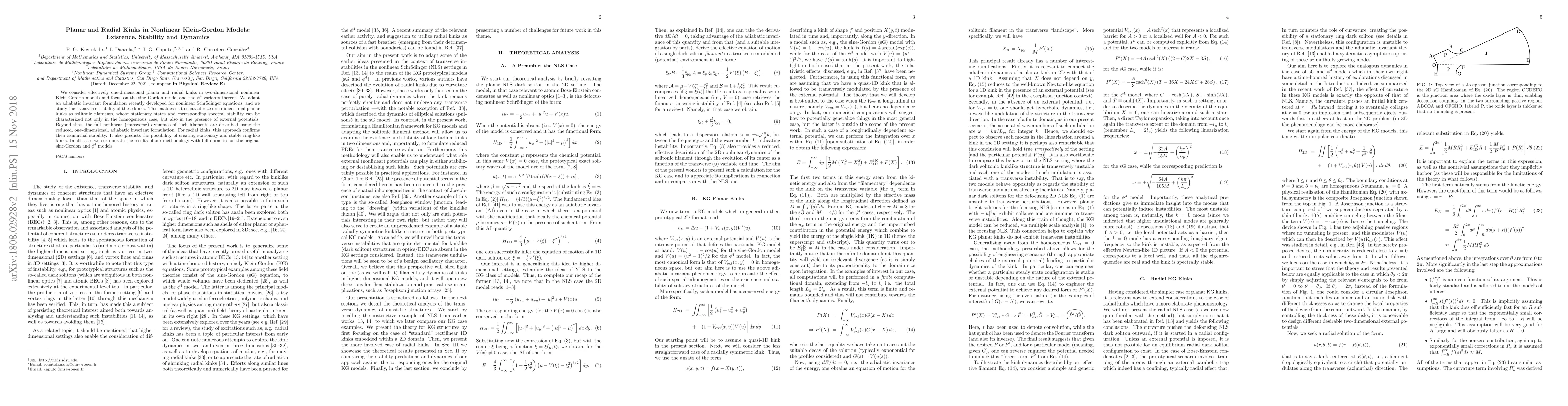 This paper investigates the existence, stability, and dynamics of planar and radial kinks in two-dimensional nonlinear Klein-Gordon models, specifically the sine-Gordon and $\phi^4$ models. It employs an adiabatic invariant formulation to study their transverse stability and describes the nonlinear dynamics of these kinks.