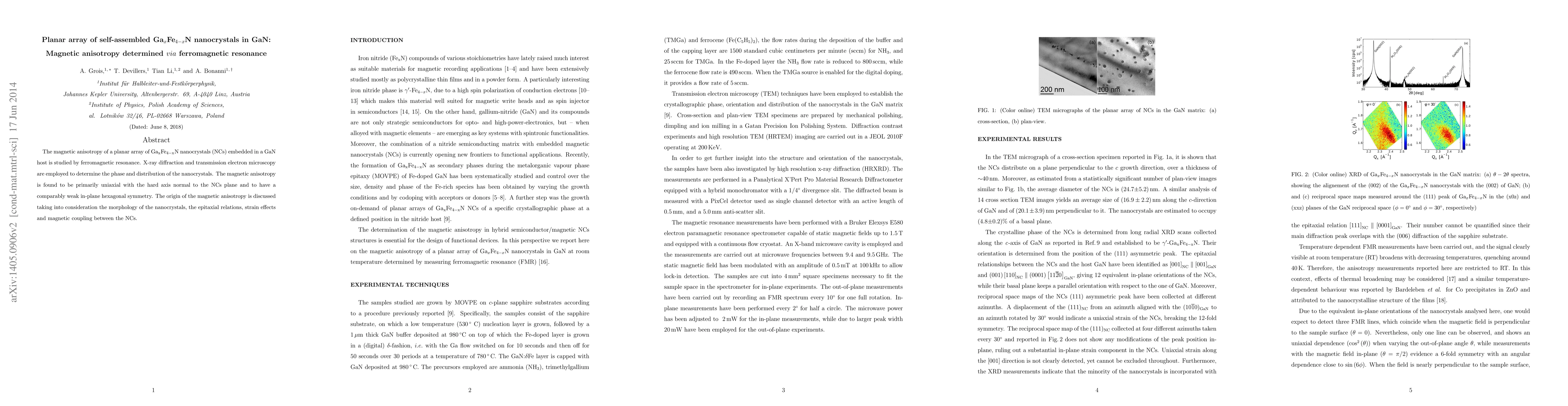 The magnetic anisotropy of a planar array of Ga$_{x}$Fe$_{4-x}$N nanocrystals (NCs) embedded in a GaN host is studied by ferromagnetic resonance. X-ray diffraction and transmission electron microscopy are employed to determine the phase and distribution of the nanocrystals. The magnetic anisotropy is found to be primarily uniaxial with the hard axis normal to the NCs plane and to have a comparably weak in-plane hexagonal symmetry. The origin of the magnetic anisotropy is discussed taking into consideration the morphology of the nanocrystals, the epitaxial relations, strain effects and magnetic coupling between the NCs.