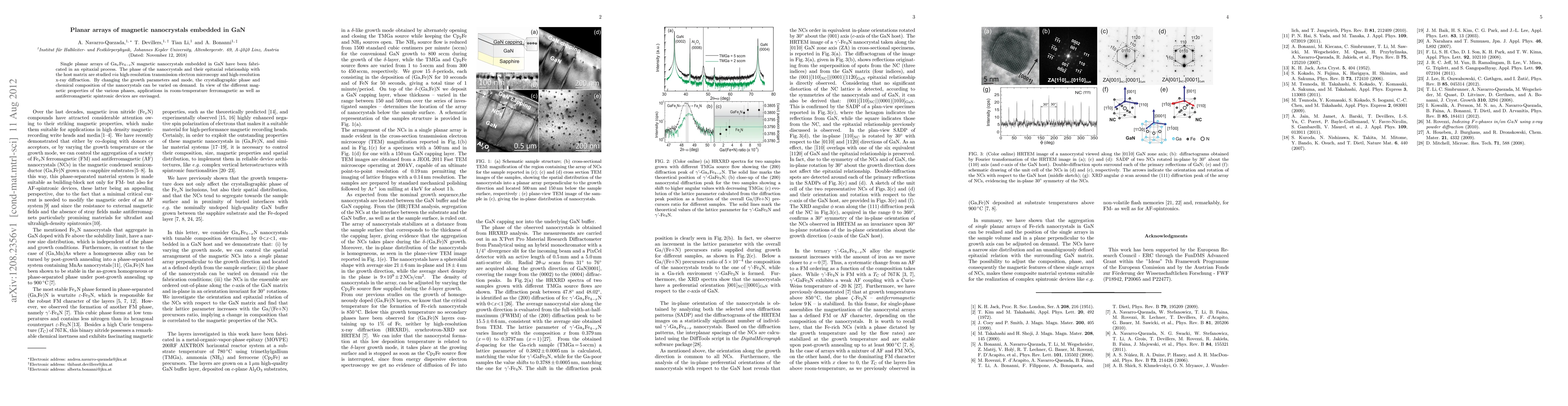 This paper details the fabrication of planar arrays of Ga(x)Fe(4-x)N magnetic nanocrystals embedded in GaN using an epitaxial process, with their phase and epitaxial relationships studied via microscopy and x-ray diffraction. The study suggests potential applications in room-temperature spintronic devices due to the tunable magnetic properties of the nanocrystals.