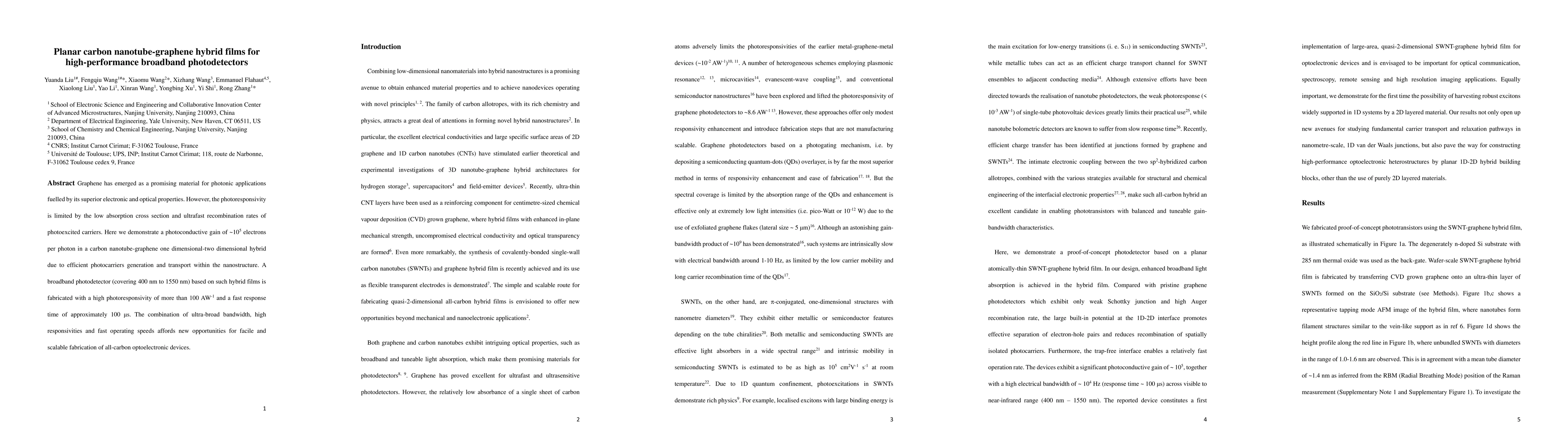 This paper demonstrates a carbon nanotube-graphene hybrid film that achieves high-performance broadband photodetection with a photoconductive gain of 10^5 electrons per photon, a photoresponsivity over 100 AW^-1, and a fast response time of ~100 μs, enabling scalable all-carbon optoelectronic devices.