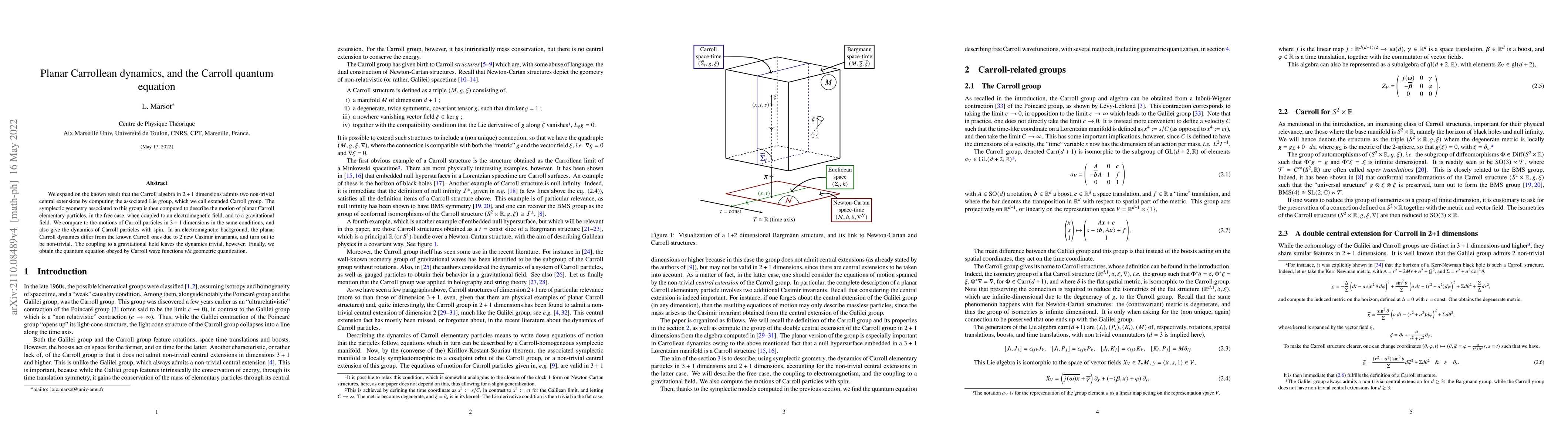 This paper explores the dynamics of planar Carroll particles in $2+1$ dimensions, deriving the extended Carroll group and its symplectic geometry. It reveals unique dynamics in electromagnetic fields due to two new Casimir invariants and discusses the trivial dynamics under gravitational coupling. The study concludes with the derivation of the quantum equation for Carroll wave functions through geometric quantization.