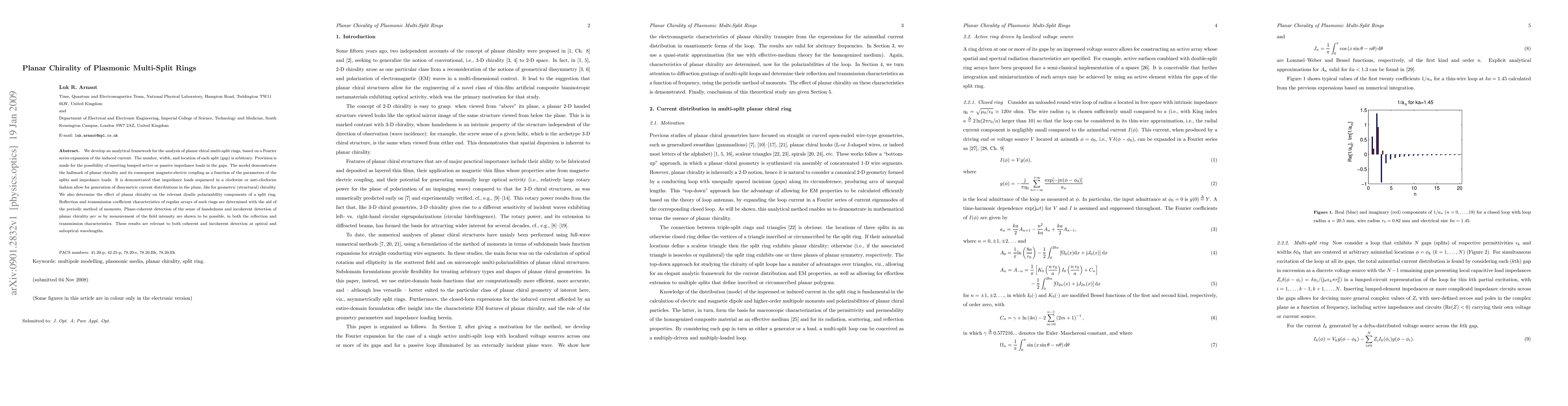 We develop an analytical framework for the analysis of planar chiral multi-split rings, based on a Fourier series expansion of the induced current. The number, width, and location of each split (gap) is arbitrary. Provision is made for the possibility of inserting lumped active or passive impedance loads in the gaps. The model demonstrates the hallmark of planar chirality and its consequent magneto-electric coupling as a function of the parameters of the splits and impedance loads. It is demonstrated that impedance loads sequenced in a clockwise or anti-clockwise fashion allow for generation of dissymetric current distributions in the plane, like for geometric (structural) chirality. We also determine the effect of planar chirality on the relevant dyadic polarizability components of a split ring. Reflection and transmission coefficient characteristics of regular arrays of such rings are determined with the aid of the periodic method of moments. Phase-coherent detection of the sense of handedness and incoherent detection of planar chirality per se by measurement of the field intensity are shown to be possible, in both the reflection and transmission characteristics. These results are relevant to both coherent and incoherent detection at optical and suboptical wavelengths.