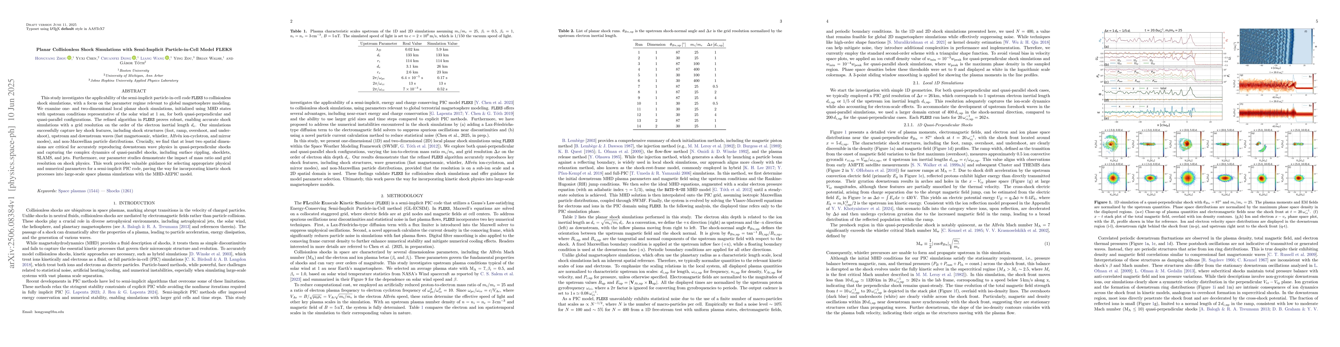 This study investigates the applicability of the semi-implicit particle-in-cell code FLEKS to collisionless shock simulations, with a focus on the parameter regime relevant to global magnetosphere modeling. We examine one- and two-dimensional local planar shock simulations, initialized using MHD states with upstream conditions representative of the solar wind at 1 au, for both quasi-perpendicular and quasi-parallel configurations. The refined algorithm in FLEKS proves robust, enabling accurate shock simulations with a grid resolution on the order of the electron inertial length $d_e$. Our simulations successfully capture key shock features, including shock structures (foot, ramp, overshoot, and undershoot), upstream and downstream waves (fast magnetosonic, whistler, Alfv\'en ion-cyclotron, and mirror modes), and non-Maxwellian particle distributions. Crucially, we find that at least two spatial dimensions are critical for accurately reproducing downstream wave physics in quasi-perpendicular shocks and capturing the complex dynamics of quasi-parallel shocks, including surface rippling, shocklets, SLAMS, and jets. Furthermore, our parameter studies demonstrate the impact of mass ratio and grid resolution on shock physics. This work provides valuable guidance for selecting appropriate physical and numerical parameters for a semi-implicit PIC code, paving the way for incorporating kinetic shock processes into large-scale space plasma simulations with the MHD-AEPIC model.