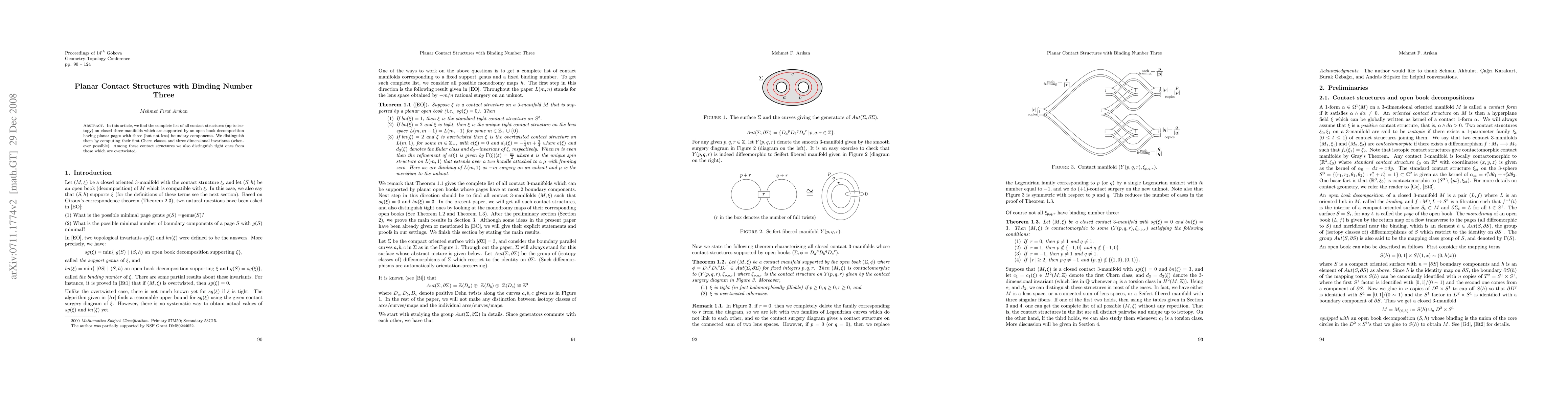 The paper's main technical contribution is the computation of first Chern classes and three-dimensional invariants to classify and distinguish contact structures on three-manifolds with planar pages and three boundary components.