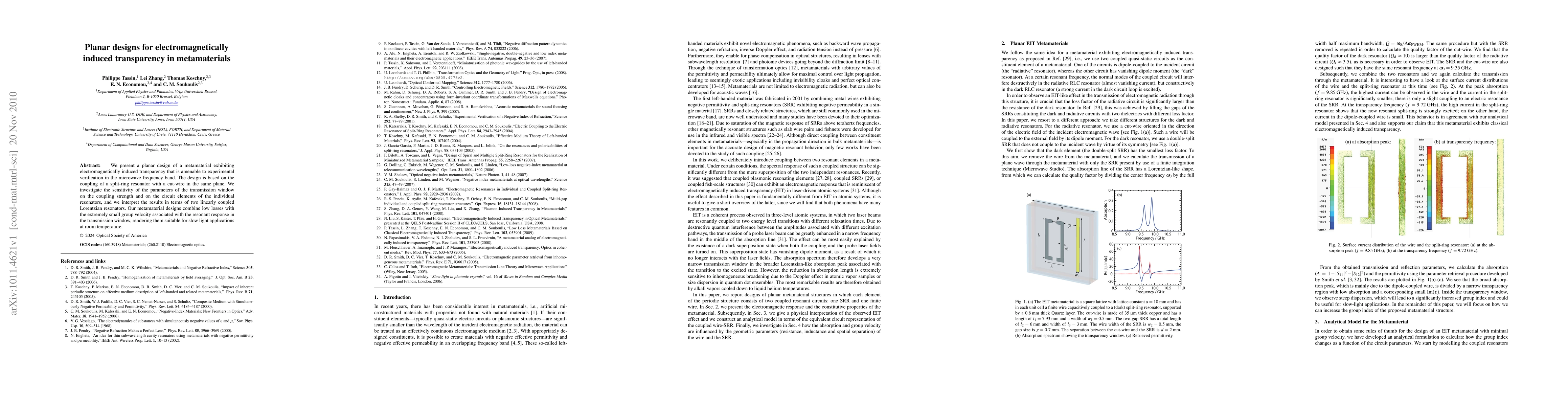 This paper introduces a planar metamaterial design featuring electromagnetically induced transparency, achieved by coupling a split-ring resonator with a cut-wire in the same plane. The design is optimized for microwave frequencies and exhibits low losses and slow group velocity, making it suitable for slow light applications at room temperature.