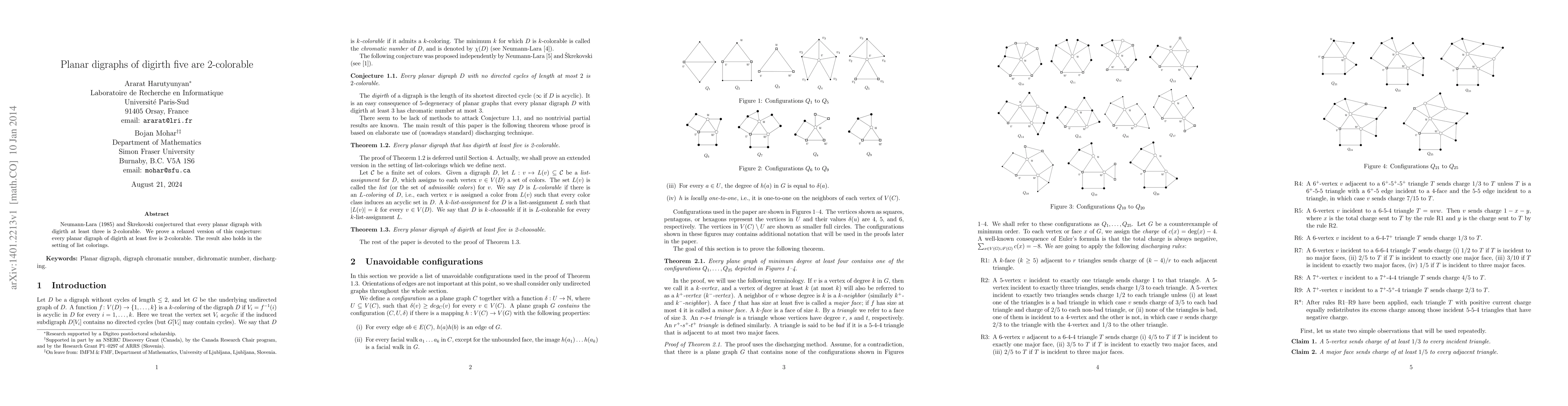 This paper proves that every planar digraph with digirth at least five is 2-colorable, supporting a relaxed version of a conjecture by Neumann-Lara and \v{S}krekovski. The result extends to list colorings as well.