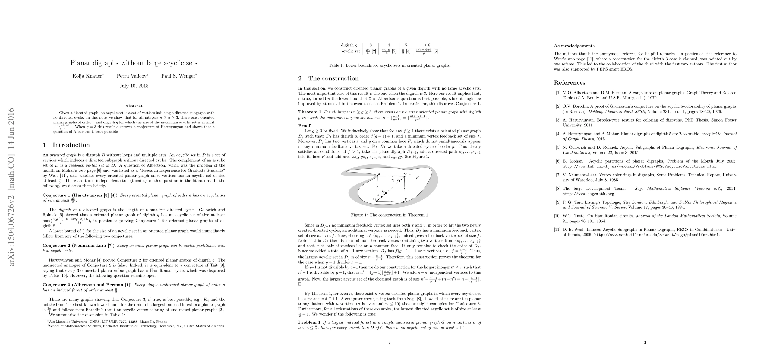 Given a directed graph, an acyclic set is a set of vertices inducing a subgraph with no directed cycle. In this note we show that there exist oriented planar graphs of order $n$ for which the size of the maximum acyclic set is at most $\lceil \frac{n+1}{2} \rceil$, for any $n$. This disproves a conjecture of Harutyunyan and shows that a question of Albertson is best possible.