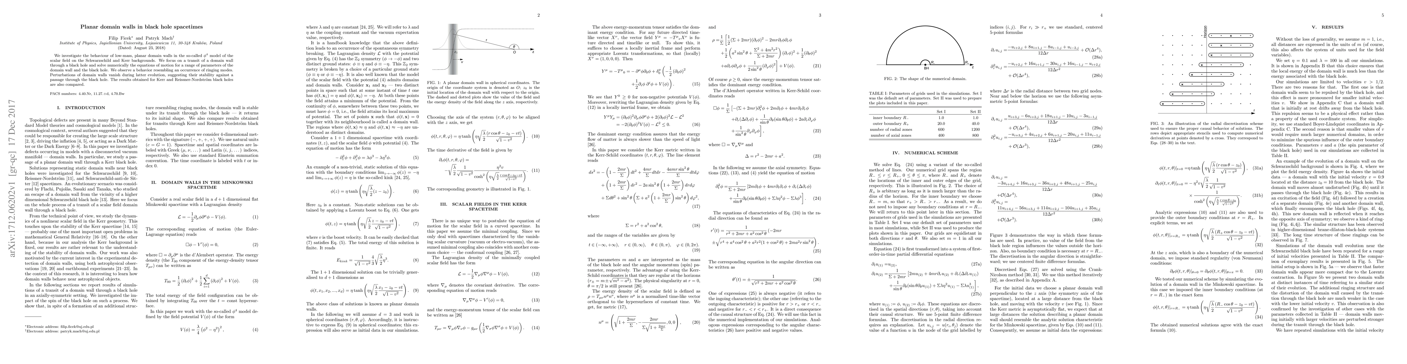 We investigate the behaviour of low-mass, planar domain walls in the so-called $\phi^4$ model of the scalar field on the Schwarzschild and Kerr backgrounds. We focus on a transit of a domain wall through a black hole and solve numerically the equations of motion for a range of parameters of the domain wall and the black hole. We observe a behavior resembling an occurrence of ringing modes. Perturbations of domain walls vanish during latter evolution, suggesting their stability against a passage through the black hole. The results obtained for Kerr and Reissner-Nordstr\"om black holes are also compared.