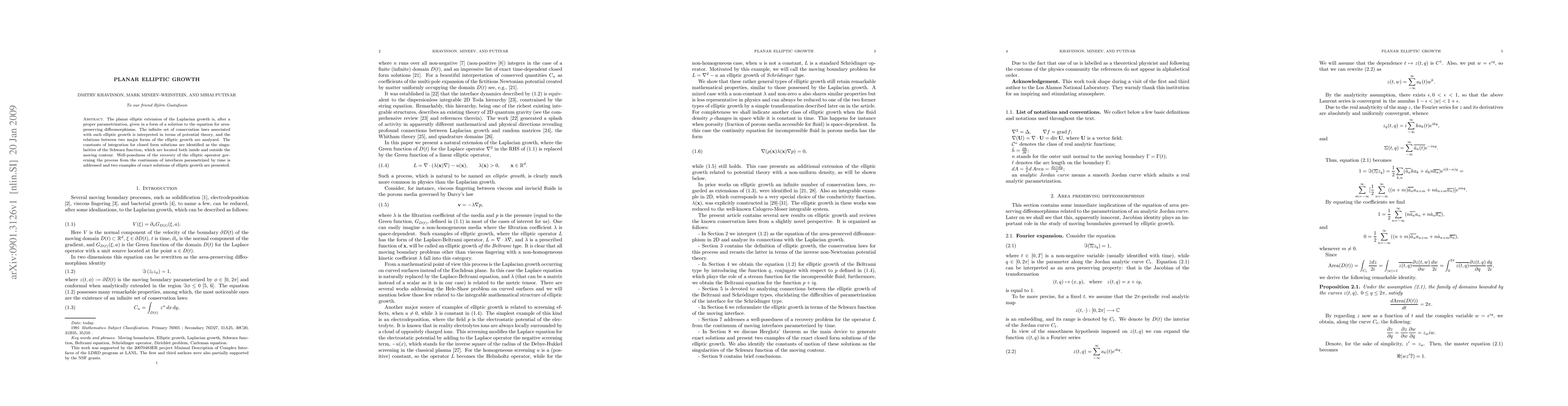 The planar elliptic extension of the Laplacian growth is, after a proper parametrization, given in a form of a solution to the equation for area-preserving diffeomorphisms. The infinite set of conservation laws associated with such elliptic growth is interpreted in terms of potential theory, and the relations between two major forms of the elliptic growth are analyzed. The constants of integration for closed form solutions are identified as the singularities of the Schwarz function, which are located both inside and outside the moving contour. Well-posedness of the recovery of the elliptic operator governing the process from the continuum of interfaces parametrized by time is addressed and two examples of exact solutions of elliptic growth are presented.