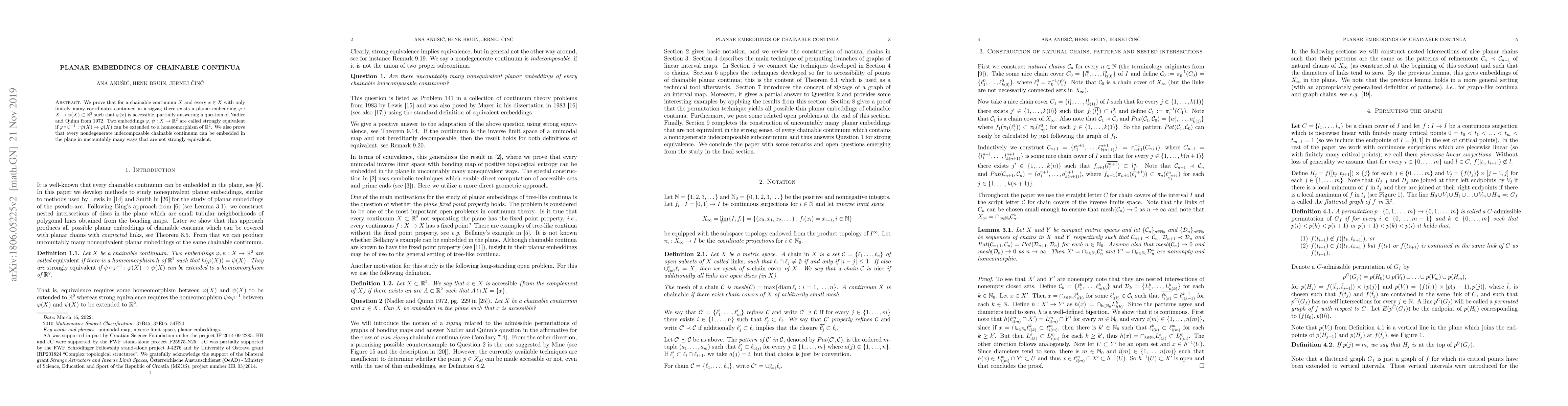 This paper proves that for a chainable continuum X, a planar embedding φ:X→φ(X)⊂ℝ² exists with φ(x) accessible, partially addressing a 1972 question by Nadler and Quinn. It also establishes that any indecomposable chainable continuum can be embedded in the plane in uncountably many strongly non-equivalent ways.