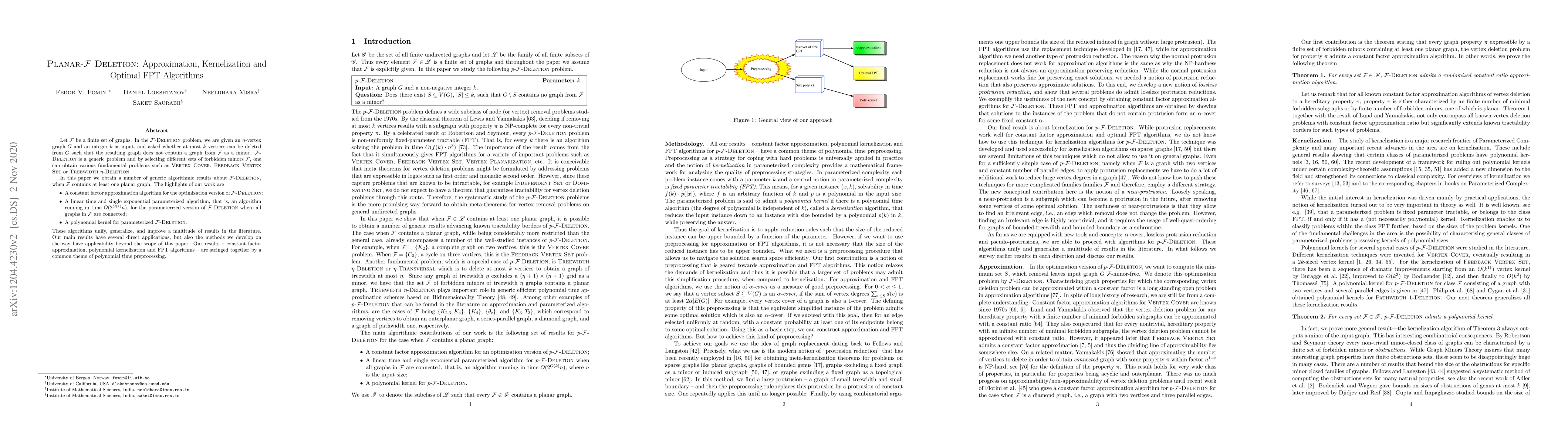 Let F be a finite set of graphs. In the F-Deletion problem, we are given an n-vertex graph G and an integer k as input, and asked whether at most k vertices can be deleted from G such that the resulting graph does not contain a graph from F as a minor. F-Deletion is a generic problem and by selecting different sets of forbidden minors F, one can obtain various fundamental problems such as Vertex Cover, Feedback Vertex Set or Treewidth t-Deletion. In this paper we obtain a number of generic algorithmic results about Planar F-Deletion, when F contains at least one planar graph. The highlights of our work are - A constant factor approximation algorithm for the optimization version of Planar F-Deletion. - A randomized linear time and single exponential parameterized algorithm, that is, an algorithm running in time O(2^{O(k)} n), for the parameterized version of Planar F-deletion where all graphs in F are connected. The algorithm can be made deterministic at the cost of making the polynomial factor in the running time n*log^2 n rather than linear. - A polynomial kernel for parameterized Planar F-deletion These algorithms unify, generalize, and improve a multitude of results in the literature. Our main results have several direct applications, but also the methods we develop on the way have applicability beyond the scope of this paper. Our results -- constant factor approximation, polynomial kernelization and FPT algorithms -- are stringed together by a common theme of polynomial time preprocessing.