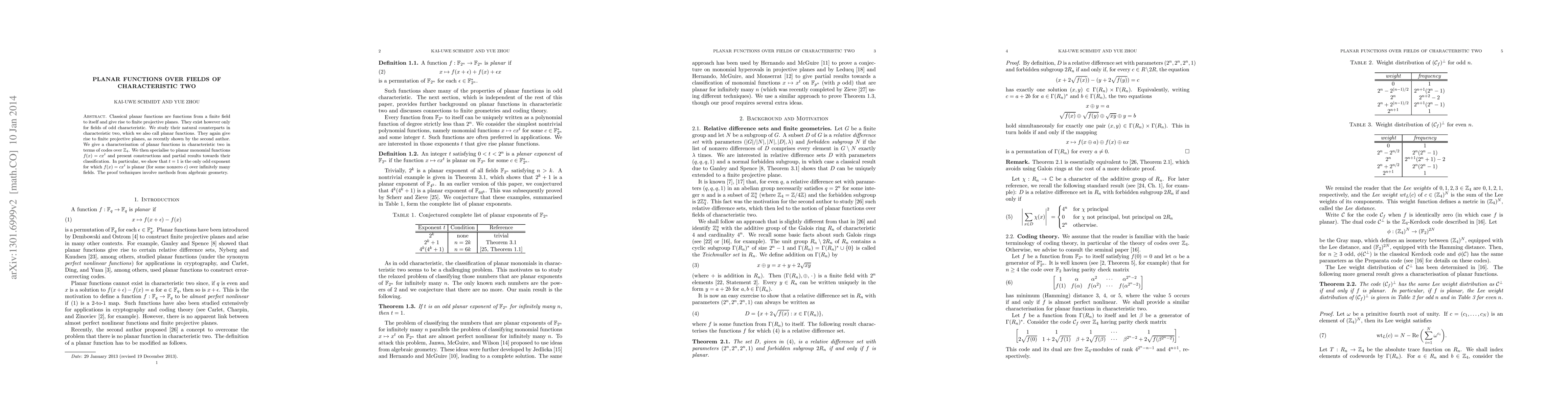 This paper characterizes planar functions in fields of characteristic two, linking them to codes over $\mathbb{Z}_4$, and studies planar monomial functions $f(x)=cx^t$, showing that $t=1$ is the only odd exponent for which these functions are planar over infinitely many fields, using algebraic geometry techniques.