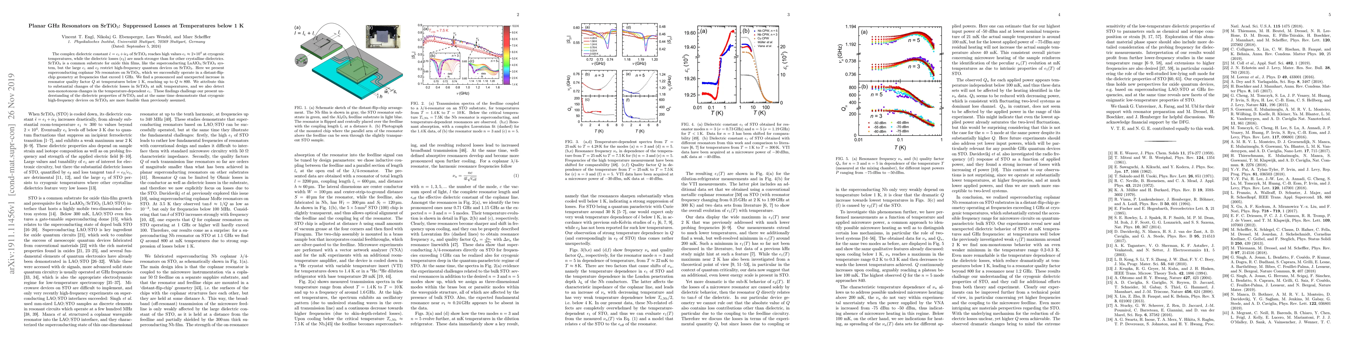 The complex dielectric constant $\hat{\epsilon} = \epsilon_1 + i \epsilon_2$ of SrTiO$_3$ reaches high values $\epsilon_1 \approx 2*10^{4}$ at cryogenic temperatures, while the dielectric losses ($\epsilon_2$) are much stronger than for other crystalline dielectrics. SrTiO$_3$ is a common substrate for oxide thin films, like the superconducting LaAlO$_3$/SrTiO$_3$ system, but the large $\epsilon_1$ and $\epsilon_2$ restrict high-frequency quantum devices on SrTiO$_3$. Here we present superconducting coplanar Nb resonators on SrTiO$_3$, which we successfully operate in a distant-flip-chip geometry at frequencies that exceed 1 GHz. We find a pronounced and unexpected increase in resonator quality factor $Q$ at temperatures below 1 K, reaching up to $Q \approx 800$. We attribute this to substantial changes of the dielectric losses in SrTiO$_3$ at mK temperatures, and we also detect non-monotonous changes in the temperature-dependent $\epsilon_1$. These findings challenge our present understanding of the dielectric properties of SrTiO$_3$ and at the same time demonstrate that cryogenic high-frequency devices on SrTiO$_3$ are more feasible than previously assumed.