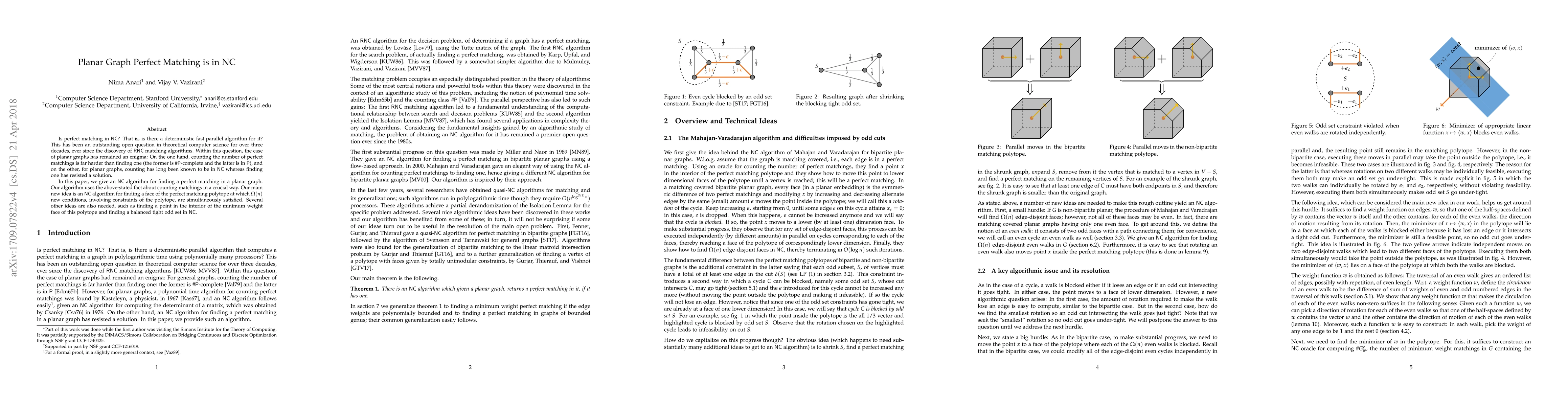 This paper presents a deterministic fast parallel algorithm (NC) for finding a perfect matching in planar graphs, resolving a long-standing open question. The authors leverage the known NC algorithm for counting perfect matchings and introduce a novel approach to identify a face of the matching polytope where multiple conditions are satisfied simultaneously.