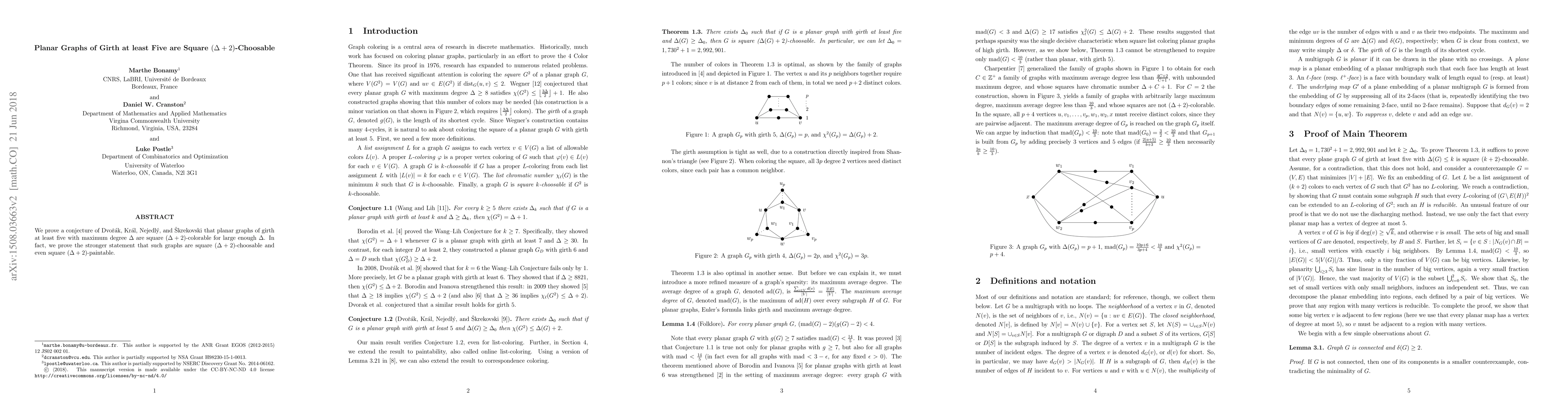 This paper proves that planar graphs with girth at least five are square $(\Delta+2)$-colorable for sufficiently large maximum degree $\Delta$, confirming a conjecture by Dvořák et al. It also demonstrates that these graphs are square $(\Delta+2)$-choosable and $(\Delta+2)$-paintable.