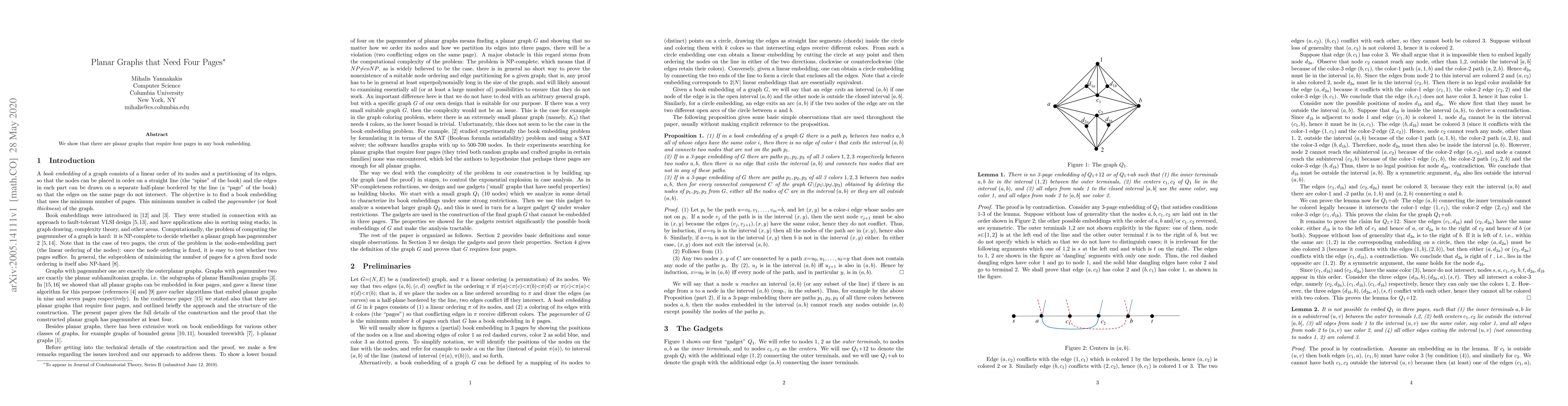 We show that there are planar graphs that require four pages in any book embedding.