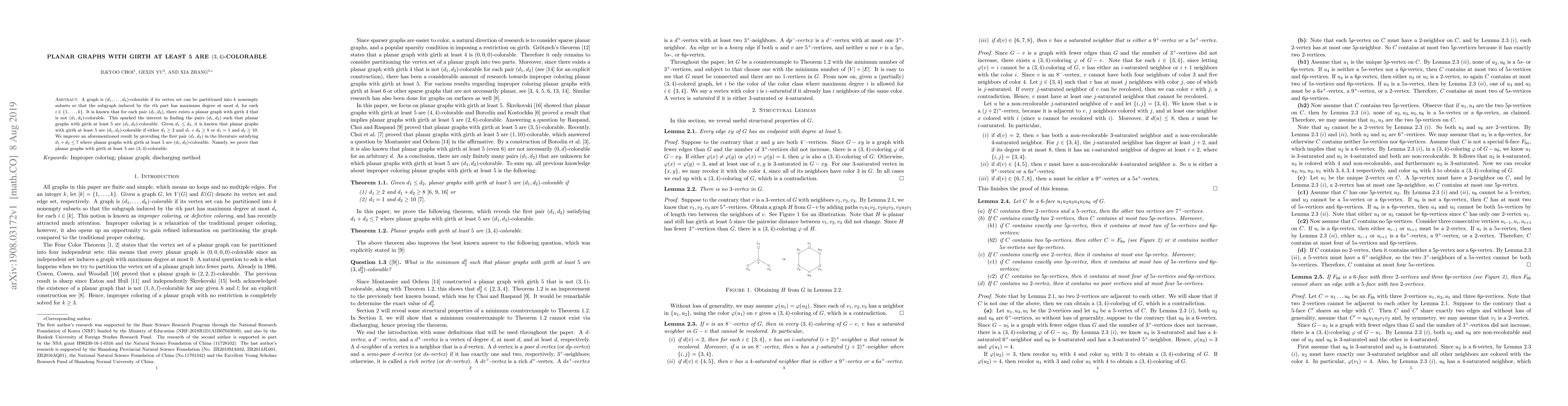 The paper demonstrates that planar graphs with girth at least 5 can be $(3, 4)$-colored, improving previous results by showing this can be achieved with the minimal pair $(d_1, d_2)$ satisfying $d_1+d_2\leq 7$. This provides new insights into the coloring properties of such planar graphs.