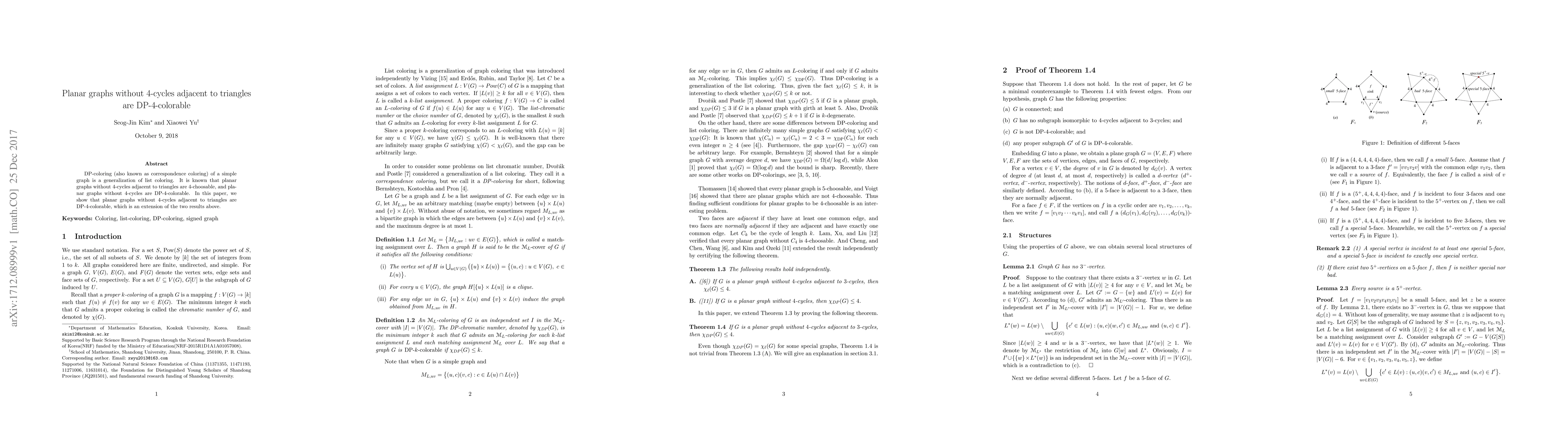 This paper demonstrates that planar graphs without 4-cycles adjacent to triangles are DP-4-colorable, extending the results that such graphs are 4-choosable and that planar graphs without 4-cycles are DP-4-colorable.