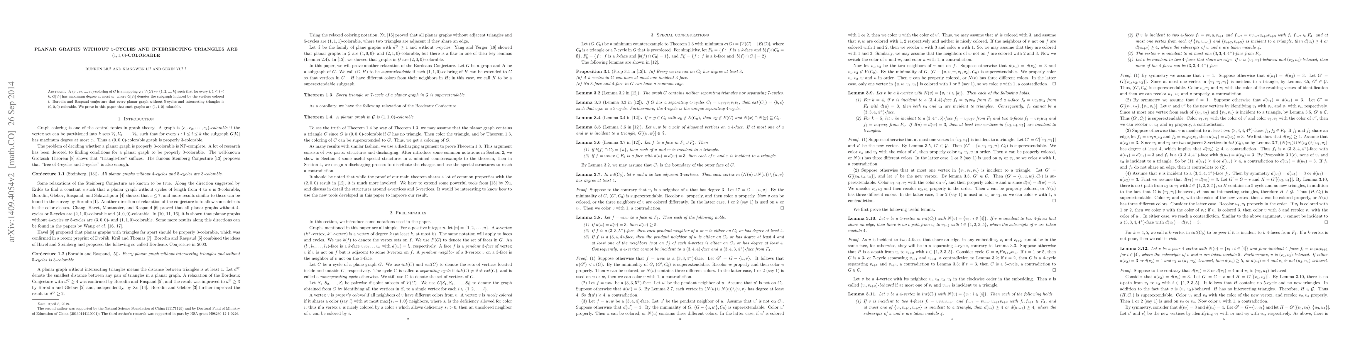 This paper proves that planar graphs without 5-cycles and intersecting triangles can be $(1,1,0)$-colored, meaning they can be colored such that each color class has a subgraph with maximum degree at most 1, 1, and 0 respectively. This supports the conjecture by Borodin and Raspaud that such graphs are $(0,0,0)$-colorable by showing they are at least $(1,1,0)$-colorable.