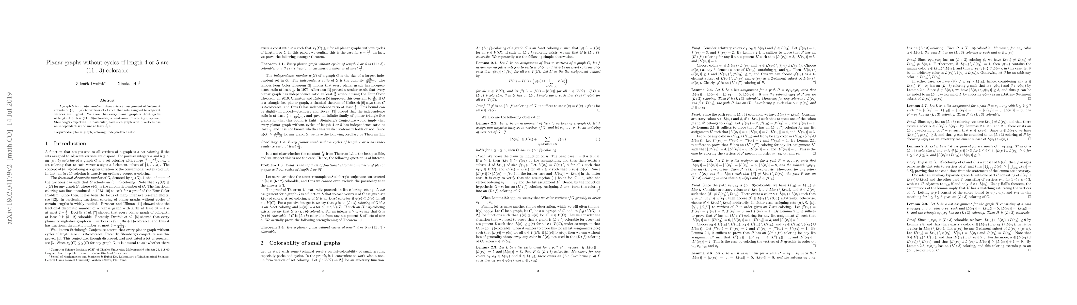A graph G is (a:b)-colorable if there exists an assignment of b-element subsets of {1,...,a} to vertices of G such that sets assigned to adjacent vertices are disjoint. We show that every planar graph without cycles of length 4 or 5 is (11:3)-colorable, a weakening of recently disproved Steinberg's conjecture. In particular, each such graph with n vertices has an independent set of size at least 3n/11.