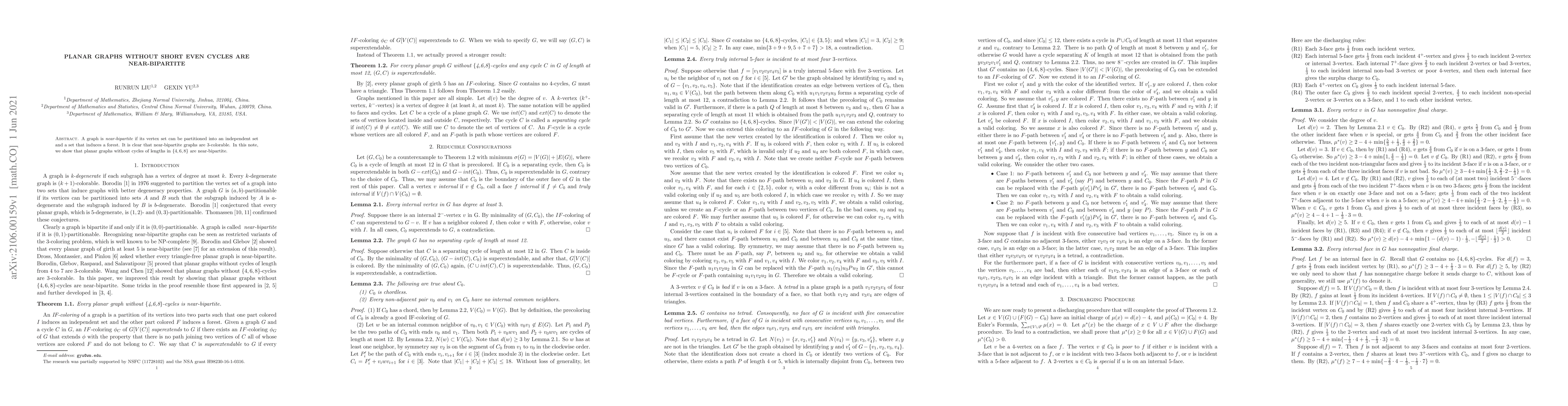This paper proves that planar graphs excluding short even cycles of lengths 4, 6, and 8 are near-bipartite, implying they are 3-colorable. The result leverages the absence of these specific even cycles to achieve a bipartite-like structure.