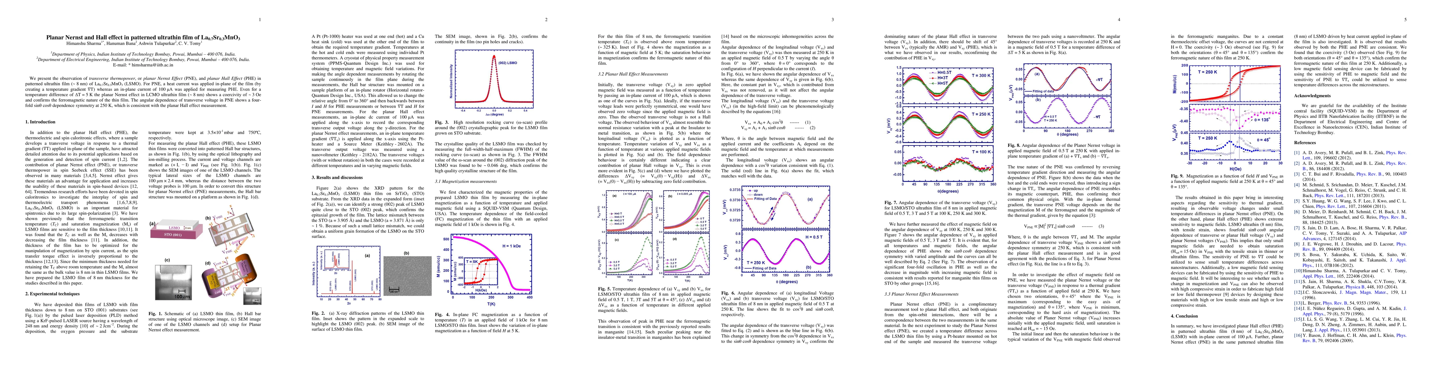 We present the observation of a transverse thermopower, or Planar Nernst Effect, in patterned ultrathin film (8 nm) of La0.7Sr0.3MnO3 (LSMO) driven by heat current applied in-plane of the film and Planar Hall Effect (PHE) in the same LSMO ultrathin film with in-plane current of 100 microA is also investigated. Even for temperature difference of 5 K the Planar Nernst Effect in ultrathin film (8 nm) shows a coercivity of 3 Oe same as observed in Planar Hall Effect measurement and confirms the ferromagnetic nature of thin film. The angular dependence of transverse voltages shows four-fold sin{theta} cos{theta} dependence symmetry at 250 K, which is consistent with Planar Hall Effect measurement.
