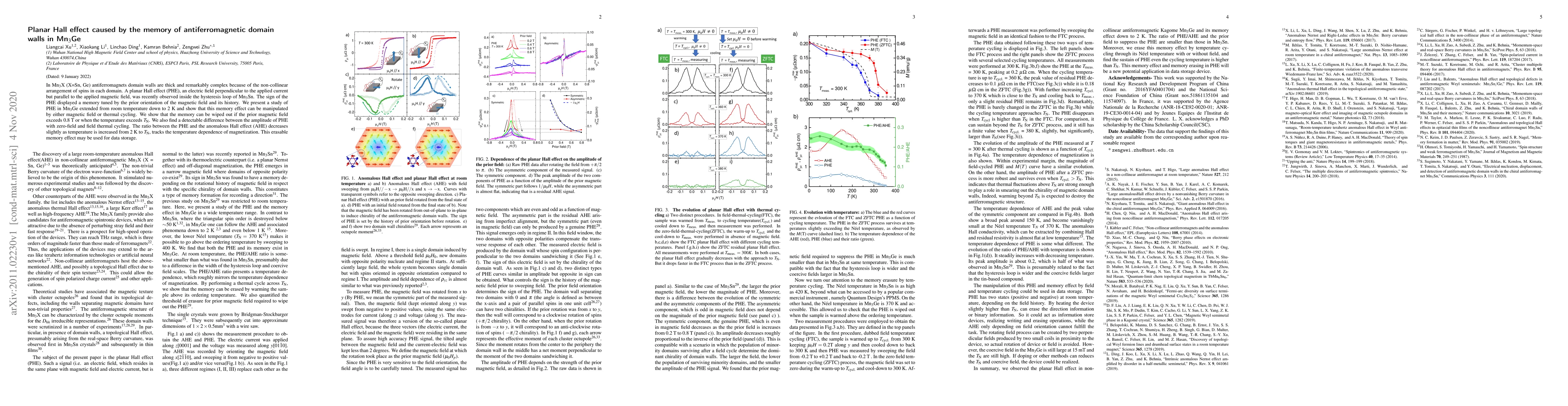 In Mn$_3$X (X=Sn, Ge) antiferromagnets domain walls are thick and remarkably complex because of the non-collinear arrangement of spins in each domain. A planar Hall effect (PHE), an electric field perpendicular to the applied current but parallel to the applied magnetic field, was recently observed inside the hysteresis loop of Mn$_3$Sn. The sign of the PHE displayed a memory tuned by the prior orientation of the magnetic field and its history. We present a study of PHE in Mn$_3$Ge extended from room temperature down to 2 K and show that this memory effect can be manipulated by either magnetic field or thermal cycling. We show that the memory can be wiped out if the prior magnetic field exceeds 0.8 T or when the temperature exceeds $T_\mathrm{N}$. We also find a detectable difference between the amplitude of PHE with zero-field and field thermal cycling. The ratio between the PHE and the anomalous Hall effect (AHE) decreases slightly as temperature is increased from 2 K to $T_{\rm{N}}$, tracks the temperature dependence of magnetization. This erasable memory effect may be used for data storage.