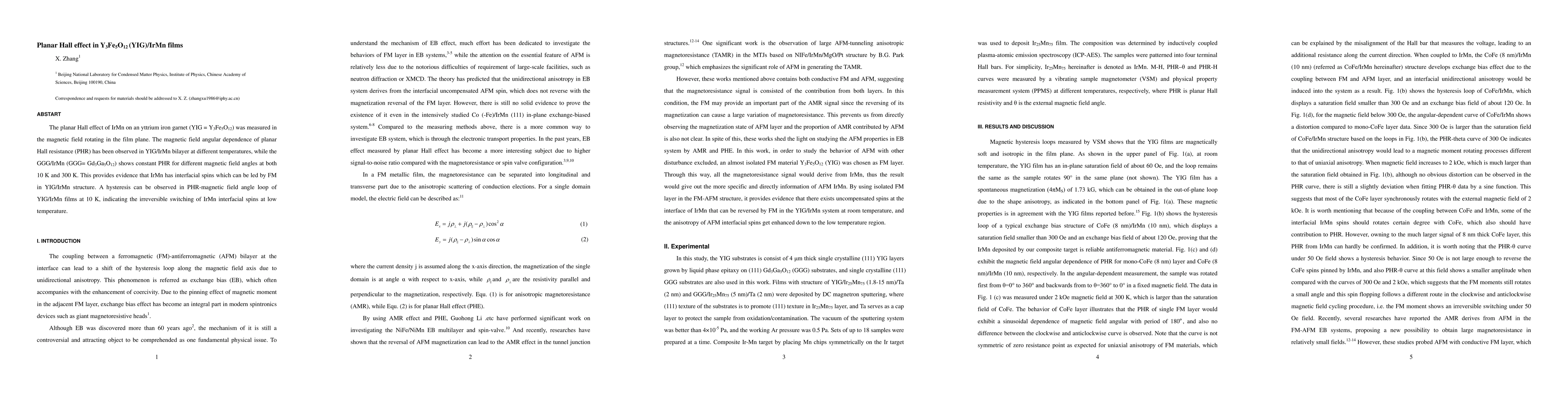 The study investigates the planar Hall effect in YIG/IrMn bilayers, revealing temperature-dependent changes in planar Hall resistance that suggest the presence of ferromagnetic interfacial spins in the structure, with hysteresis observed at low temperatures indicating irreversible spin switching.