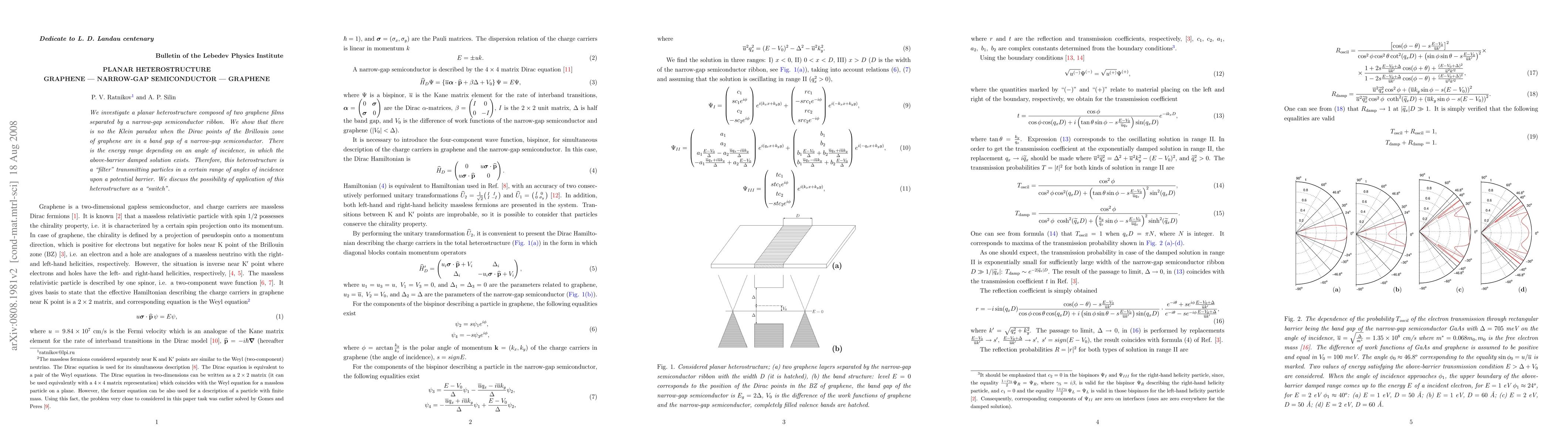 This paper explores a planar heterostructure of graphene films separated by a narrow-gap semiconductor, revealing that it functions as a "filter" transmitting particles within a specific angle range, and discusses its potential use as a "switch" based on the absence of the Klein paradox.