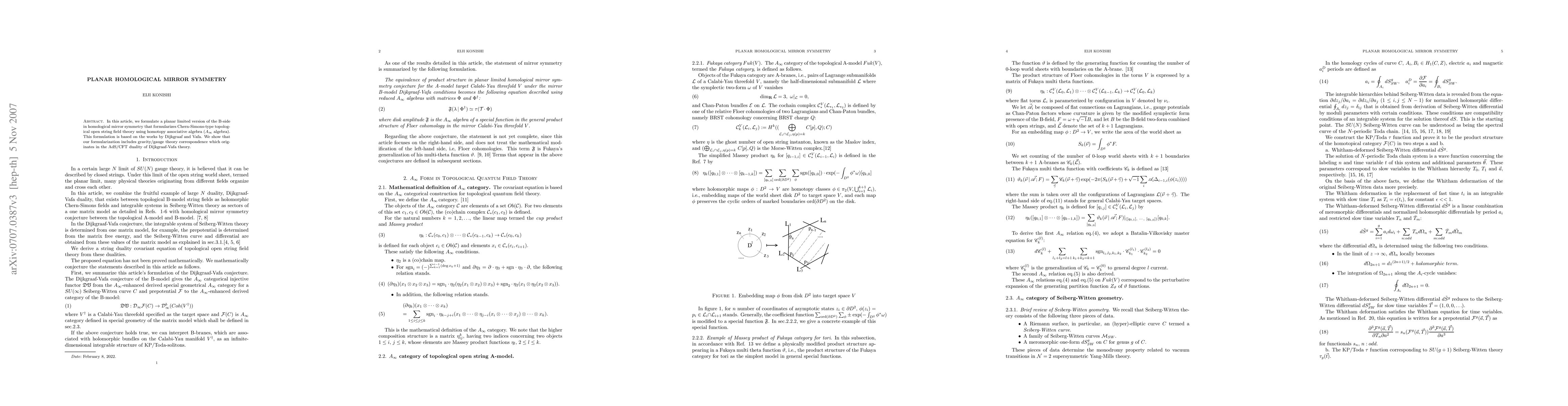 Researchers develop a planar version of homological mirror symmetry that formulates Chern-Simons-type topological open string field theory using A∞ algebra, revealing a connection to the AdS/CFT duality of Dijkgraaf-Vafa theory.