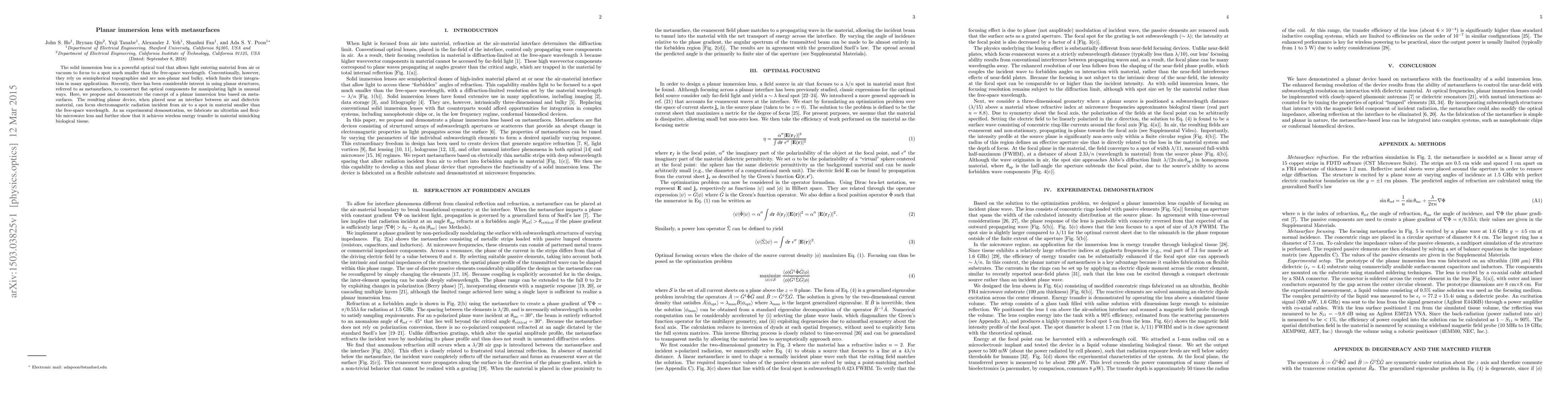 This paper proposes a planar immersion lens using metasurfaces to focus light to a spot smaller than the free-space wavelength, addressing the limitations of bulky, non-planar conventional lenses. An experimental demonstration includes an ultrathin microwave lens that achieves wireless energy transfer, mimicking biological tissue.